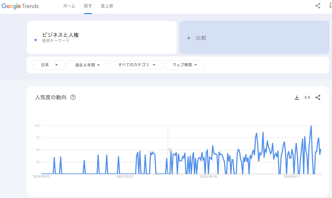 世間的にも、定期的にビジネスと人権に関するニュース・報道が出ているため、興味・関心の高まりが見られます。以下のグラフは「ビジネスと人権」とGoogleで検索された動向を表しています。左端の2019年頃の低い値のグラフから、年を経るほどグラフが高い値を推移してきていることがわかります。