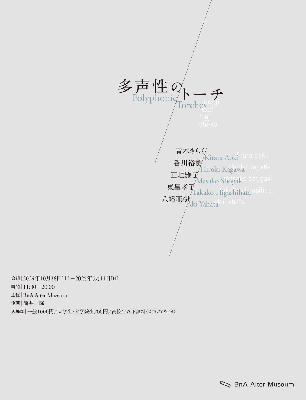 この度、BnA Alter Museumでは、階段型ギャラリーSCGにて、青木きらら(谷澤紗和子+藤野可織)、香川裕樹、正垣雅子、東畠孝子、八幡亜樹の5組のアーティストが参加する展覧会『多声性のトーチ』を開催いたします。