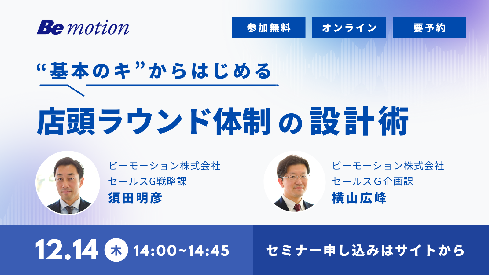 【販売・営業支援33年のビーモーション】“基本の「キ」”を知り全体像を掴む!「店頭ラウンド体制の設計術」ウェビナー開催