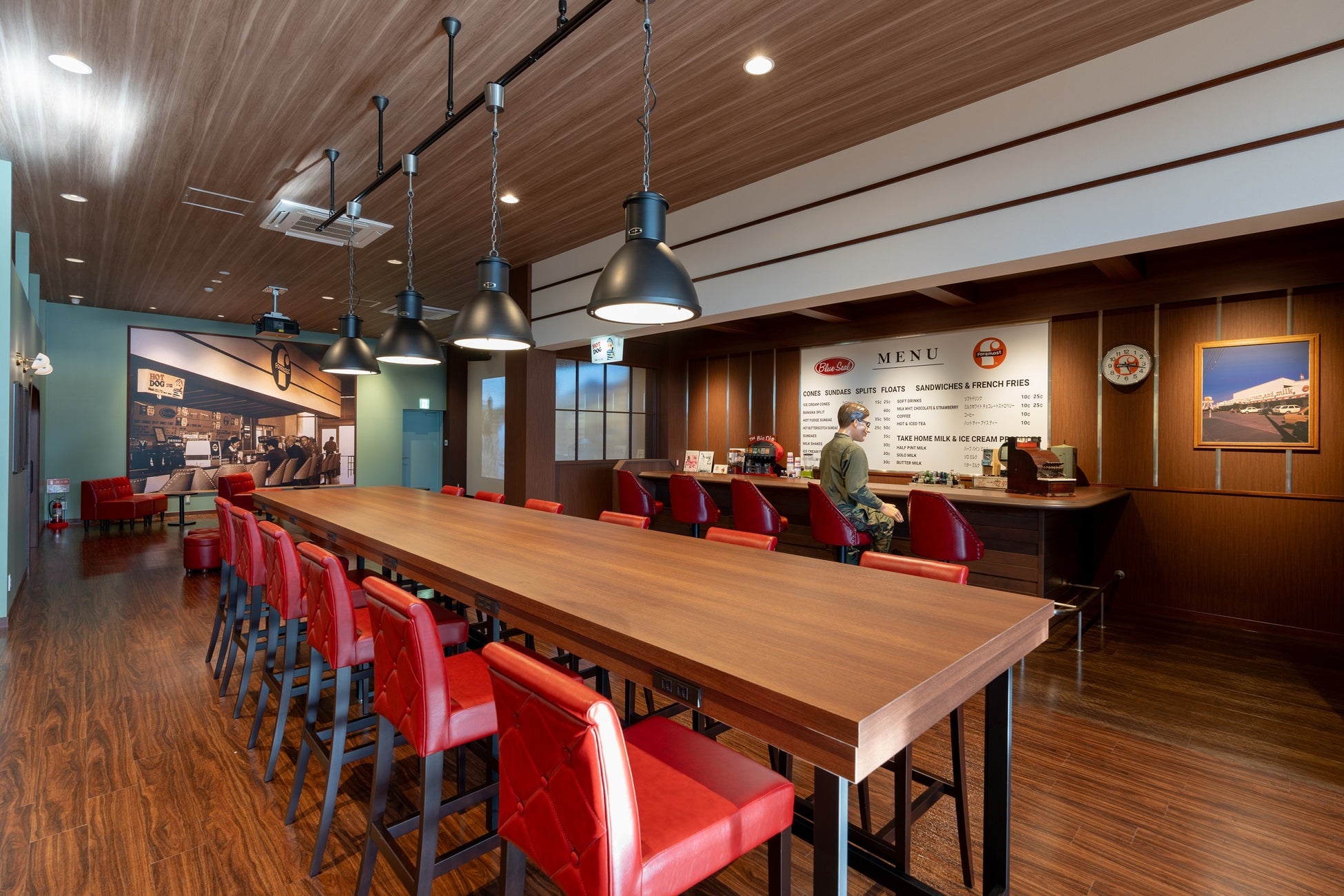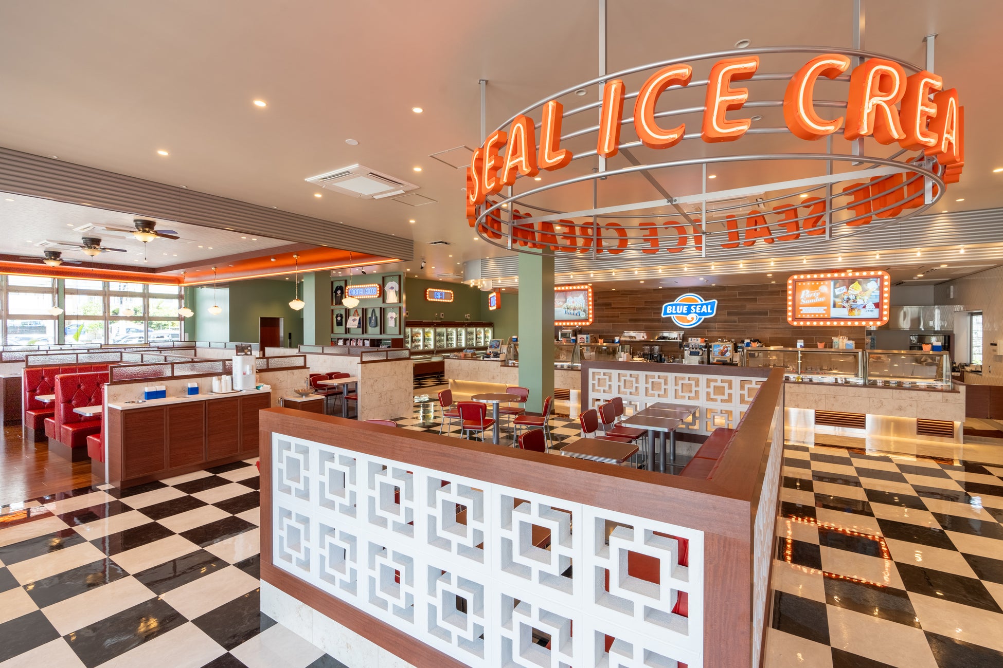 “アイスを通して笑顔の思い出を刻んでいただける”、そんな身近な存在でありたいという想いを込めた新しい牧港本店は2階建てになっており、1階は旧店舗の要素である“アメリカンダイナー”要素であるチェックのタイル、赤いレザーシートの座席、ペールグリーンの壁面に加え、新たな“沖縄”要素として、琉球石灰岩模様のパネルや、花ブロックなどを取り入れています。