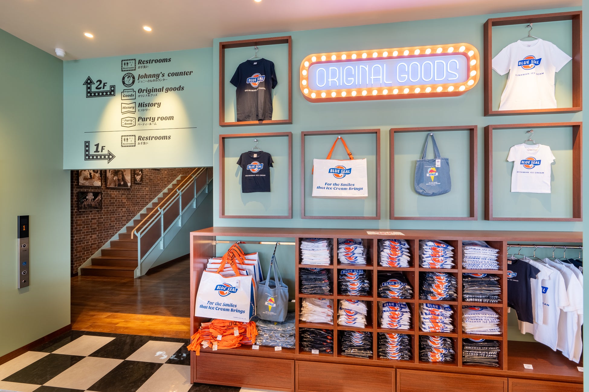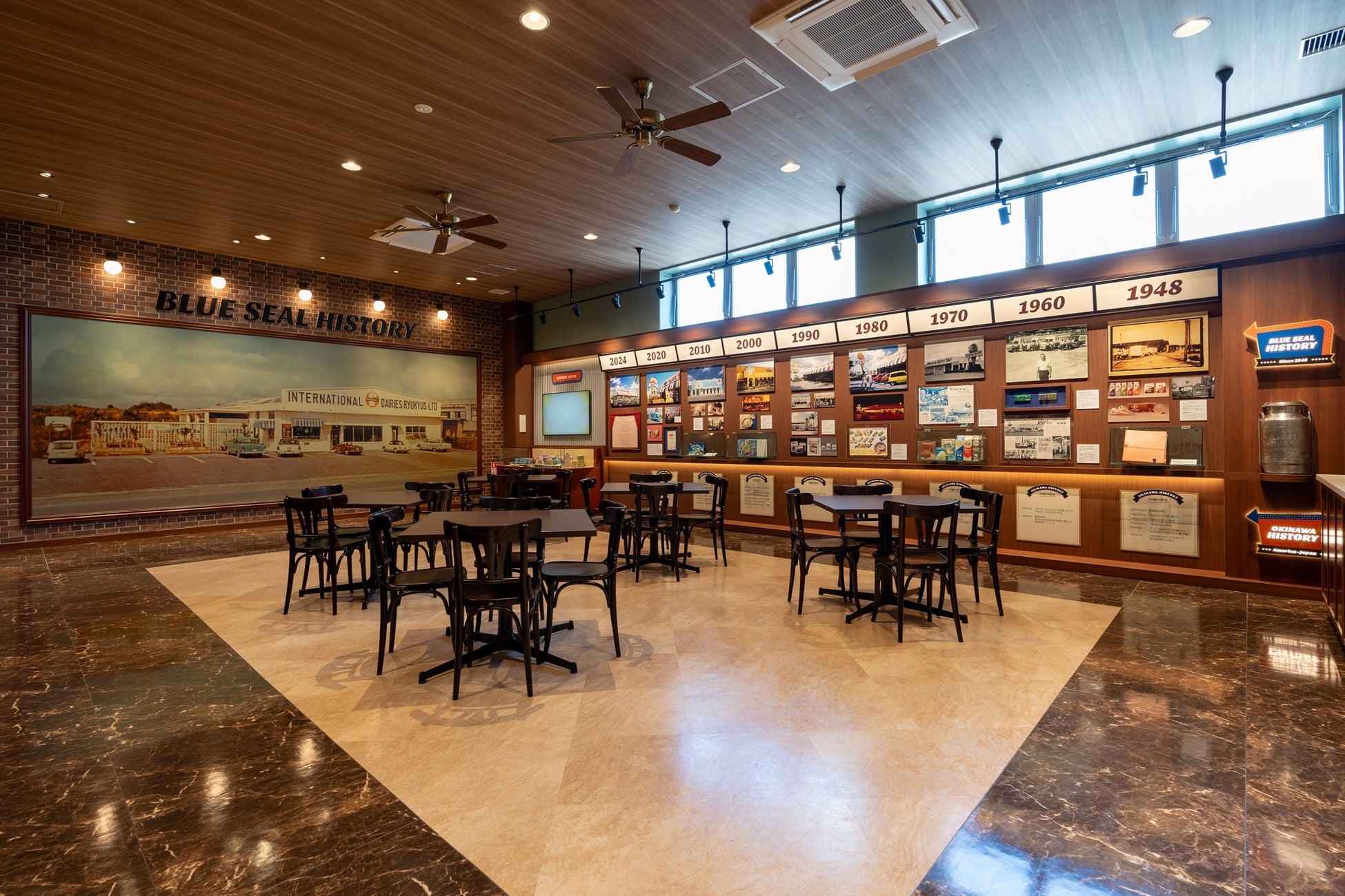 また、2階席は1階席に比べ落ち着いた空間となっています。笑顔の写真パネルが飾られた階段を上がると、1948年の創業時からこれまでのブルーシールの歴史を振り返ることのできるヒストリーコーナーがお出迎え。