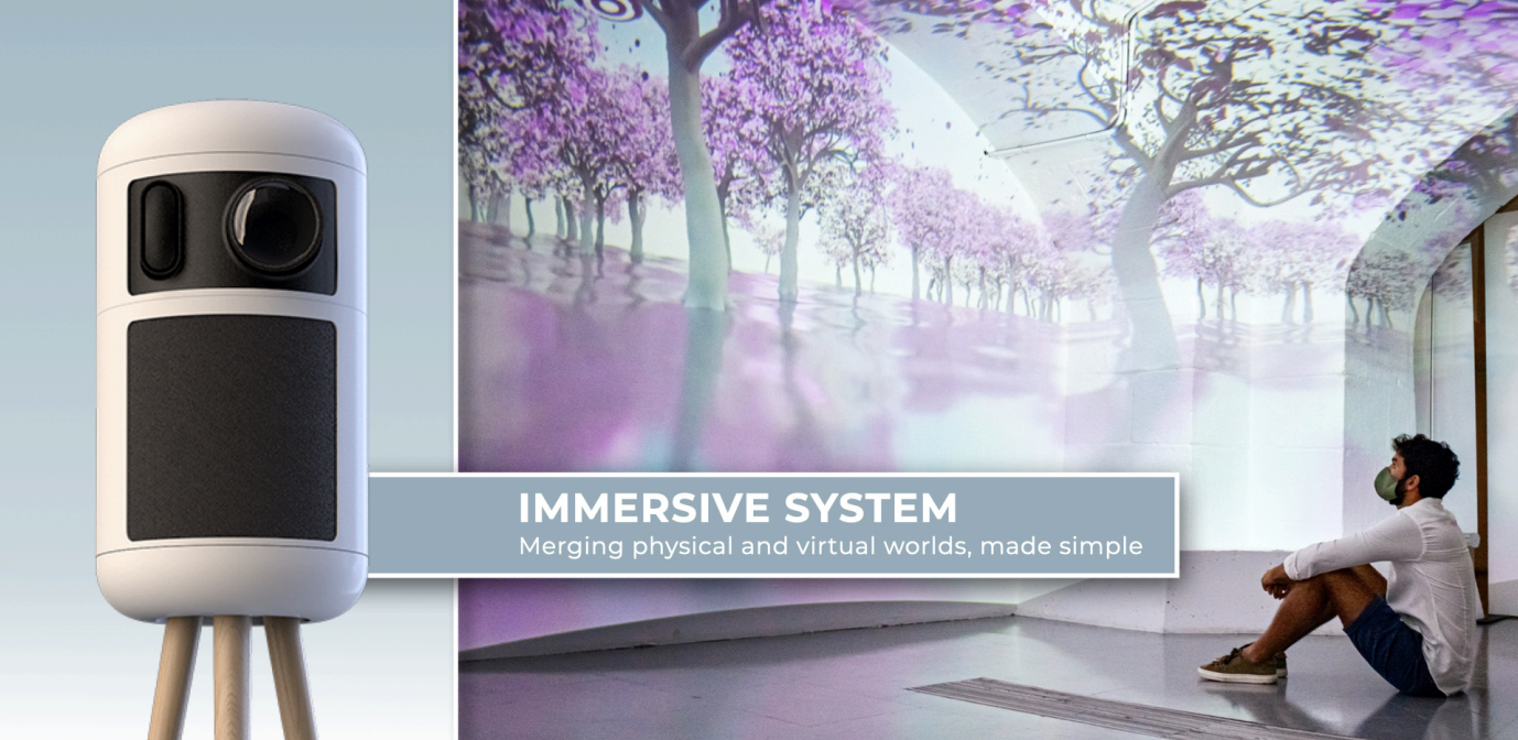 「MK360+」は壁や天井など、部屋全体にフルHD動画を投影し、プロジェクションマッピングによる没入体験を味わえる世界初の360°VRプロジェクターです。映し出される映像はゆがみを最小限に抑え、操作はスマートフォンのアプリからワイヤレスで行うことができ、簡単に補正や設定を変えられます。