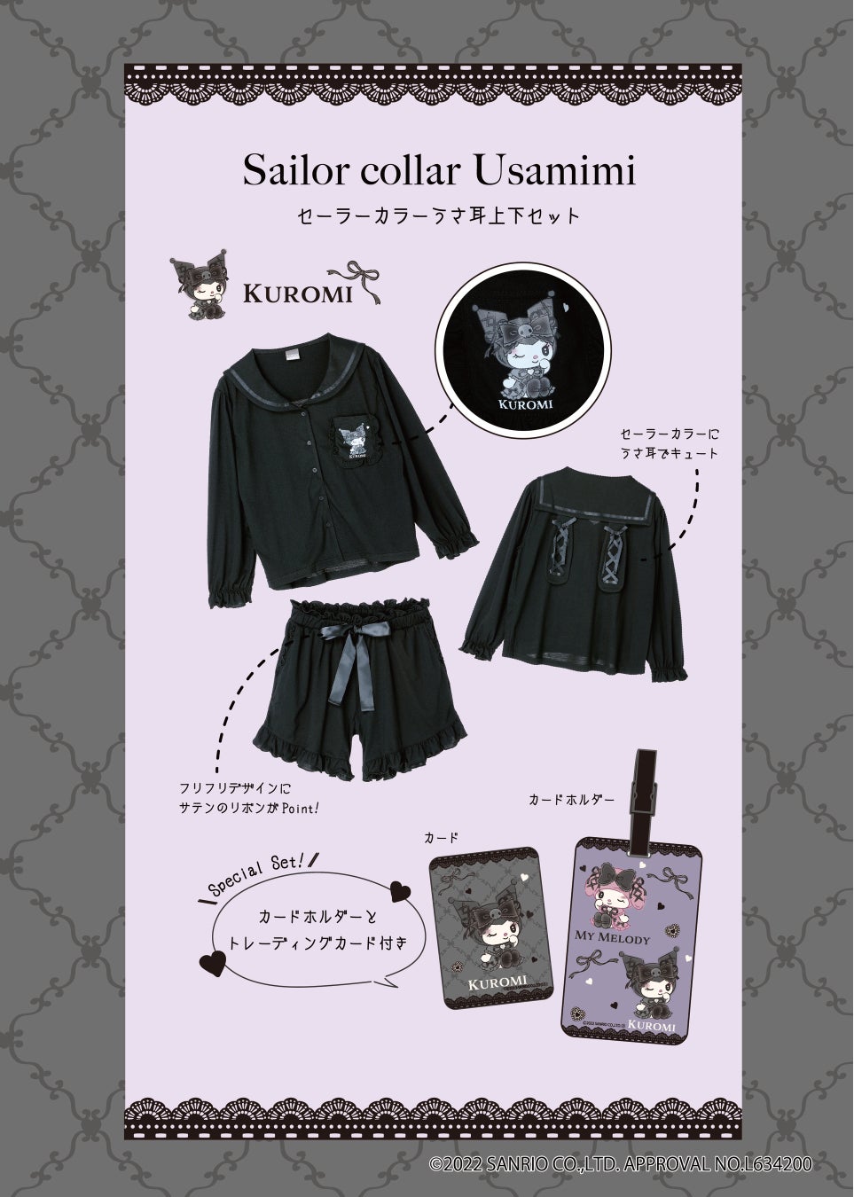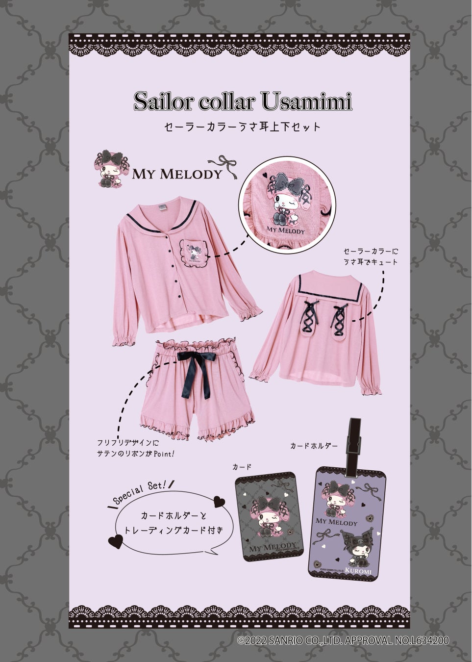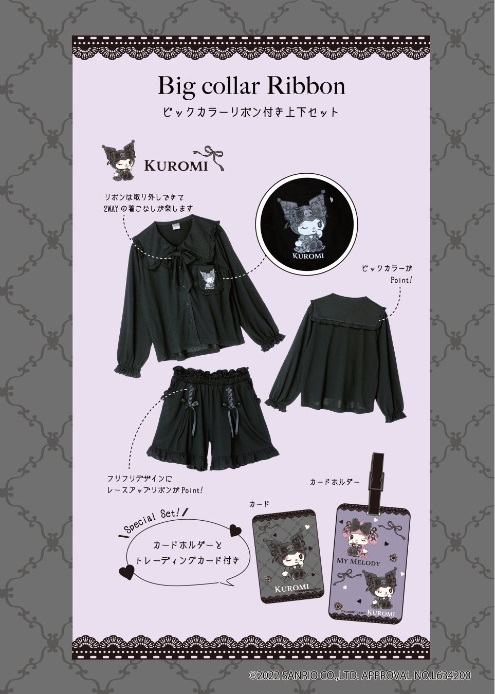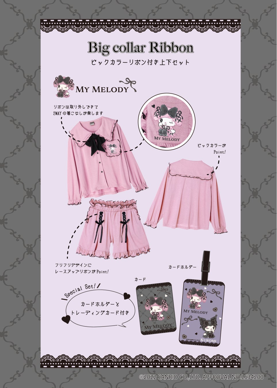 デザインは2種類あり、①セーラーカラーに編み上げリボンをあしらったうさ耳がついたトップスと、ウエストに大きなサテンリボンが付いたショートパンツのセット、②ビッグカラーに取り外し可能なリボンが付いたトップスと、編み上げリボンをあしらったショートパンツのセットです。それぞれピンクにはマイメロディのモチーフ、ブラックにはクロミのモチーフがプリントされています。