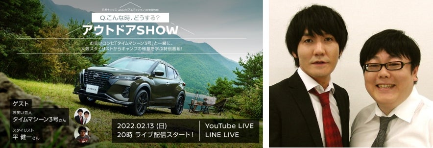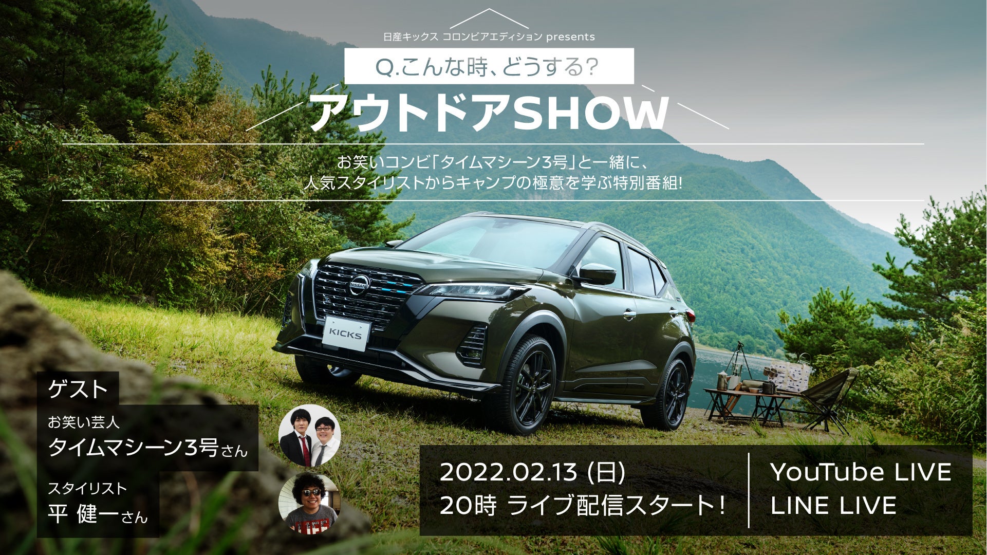 日産自動車株式会社(本社:神奈川県横浜市西区)と株式会社コロンビアスポーツウェアジャパン(本社:東京都新宿区)は、お笑いコンビ「タイムマシーン3号」をゲストにお迎えし、アウトドアブームを牽引するキャンプ歴36年の人気スタイリスト平健一さんから最新のキャンプテクニックを視聴者参加型のクイズ形式で学ぶ、特別番組「日産キックスコロンビアエディション presents こんな時、どうする?アウトドアSHOW」を、2022年2月13日(日)20時より日産公式 YouTubeチャンネル及びLINE LIVEにて生配信いたします。