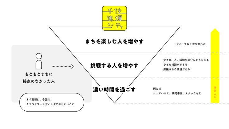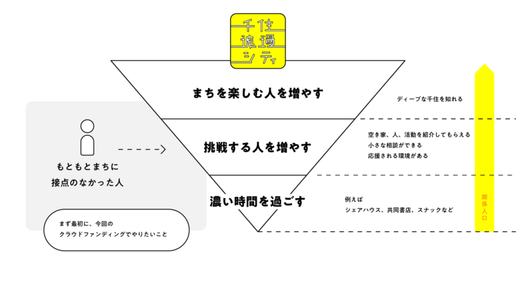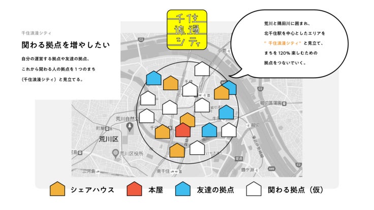 そこでまずは、知る人ぞ知るディープな街の魅力=B面を情報発信するWebメディアを作り、次に千住を楽しむコミュニティを生み、そのWebメディアと街を楽しむコミュニティを発展させ、千住の街で挑戦したい人が一歩を踏み出せる場にしていきます。