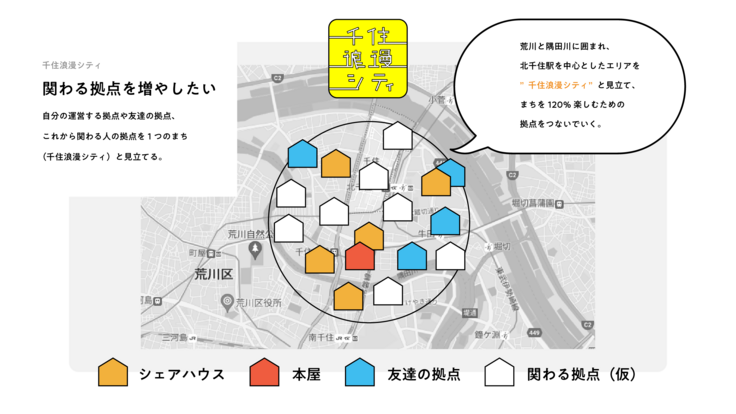 千住浪漫シティとは、【あなたのやりたいこと=浪漫を叶えることができる仮想の街】です。足立区北千住のオフラインとオンラインのちょうど狭間、2.5次元に位置し、千住のあらゆるところにフォーカスしながら、千住のどこにも存在しないコミュニティ(まち)を目指しています。