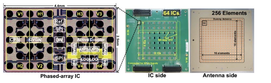 今回の研究で開発したKa帯フェーズドアレイ無線機は、二つのポートを持つアンテナ、増幅器、位相器、そしてアクティブハイブリッドカプラで構成されており、低消費電力での電気的な指向性制御を可能としています。新たに考案されたアクティブハイブリッドカプラ回路技術では、フェーズドアレイ無線機の消費電力を大幅に減らすことができ、これを使用すれば従来よりも高速でリアルタイム性の高いデータ通信が可能となります。