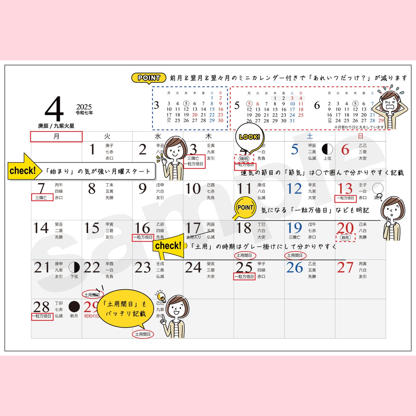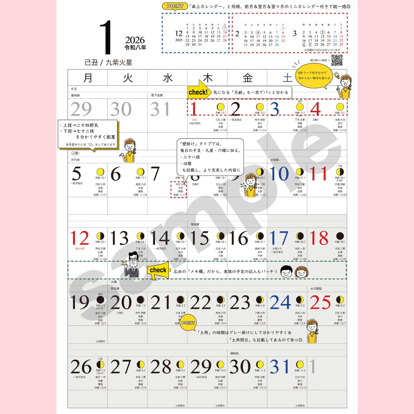 六曜・干支・九星・土用・二十四節気・一粒万倍日・天赦日などの暦情報を掲載した人気カレンダーシリーズ。卓上版に加え、より多彩な暦情報を収録した壁掛け版も展開しています。