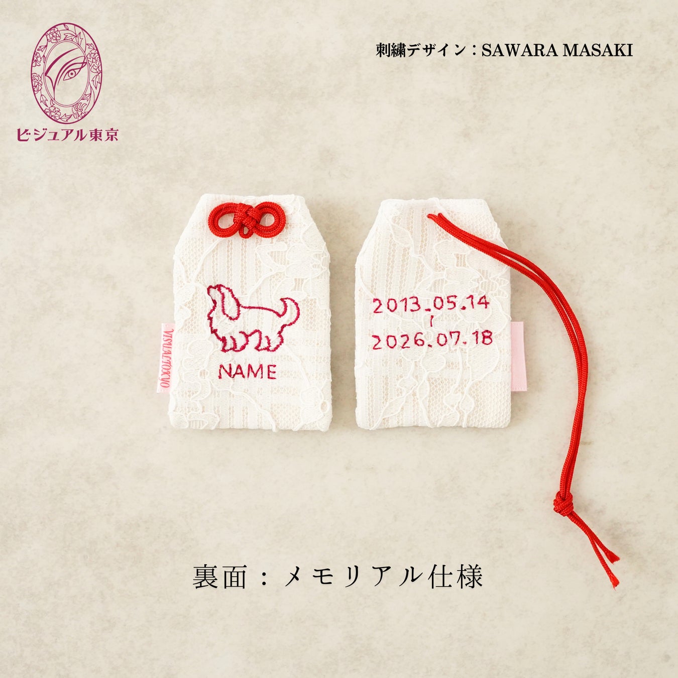 レギュラーサイズのお守りには、生没年を刺繍できるメモリアルオプションを用意。