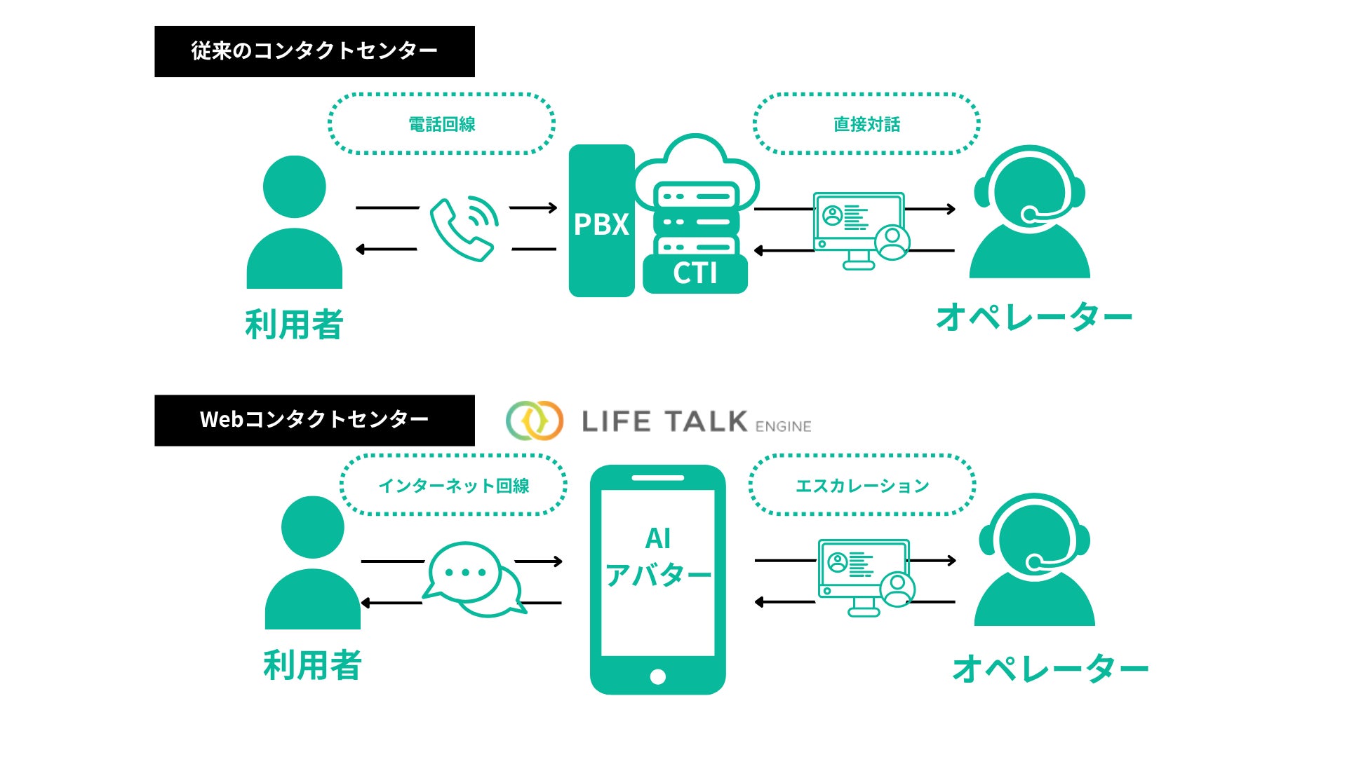 AIによる一次対応から、人による対応へのエスカレーション(切り替え)が可能であり、効率性と柔軟性を兼ね備えたハイブリッド型のコンタクトセンター運用が可能になるため顧客満足と業務最適化を両立できる