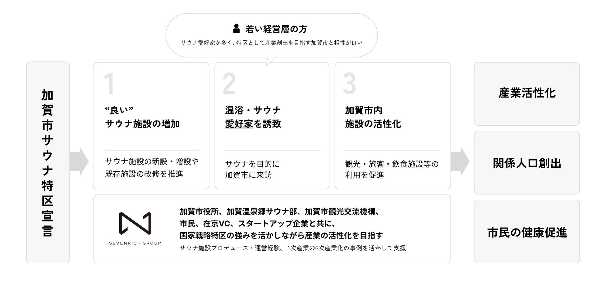加賀温泉郷の三温泉などの資源と、セブンリッチのサウナ施設プロデュースや運営の経験を活かし、加賀市と地元住民、セブンリッチが協力して産業の活性化を目指します。