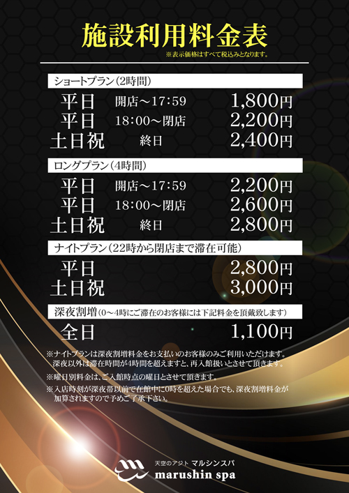 マルシンスパではこれまでショートコースを90分とさせていただいておりましたが、サウナ・水風呂・外気浴を3セット楽しむ方が多くを占める中で、90分という時間は少し忙しないという声をいただいておりました。今回の改訂においては、時間を気にせずゆっくりサウナを楽しめるよう、ショートプランを2時間、ロングプランを4時間へと変更させていただきます。