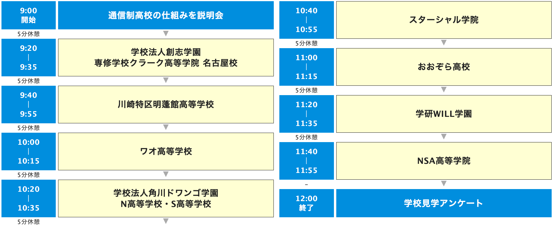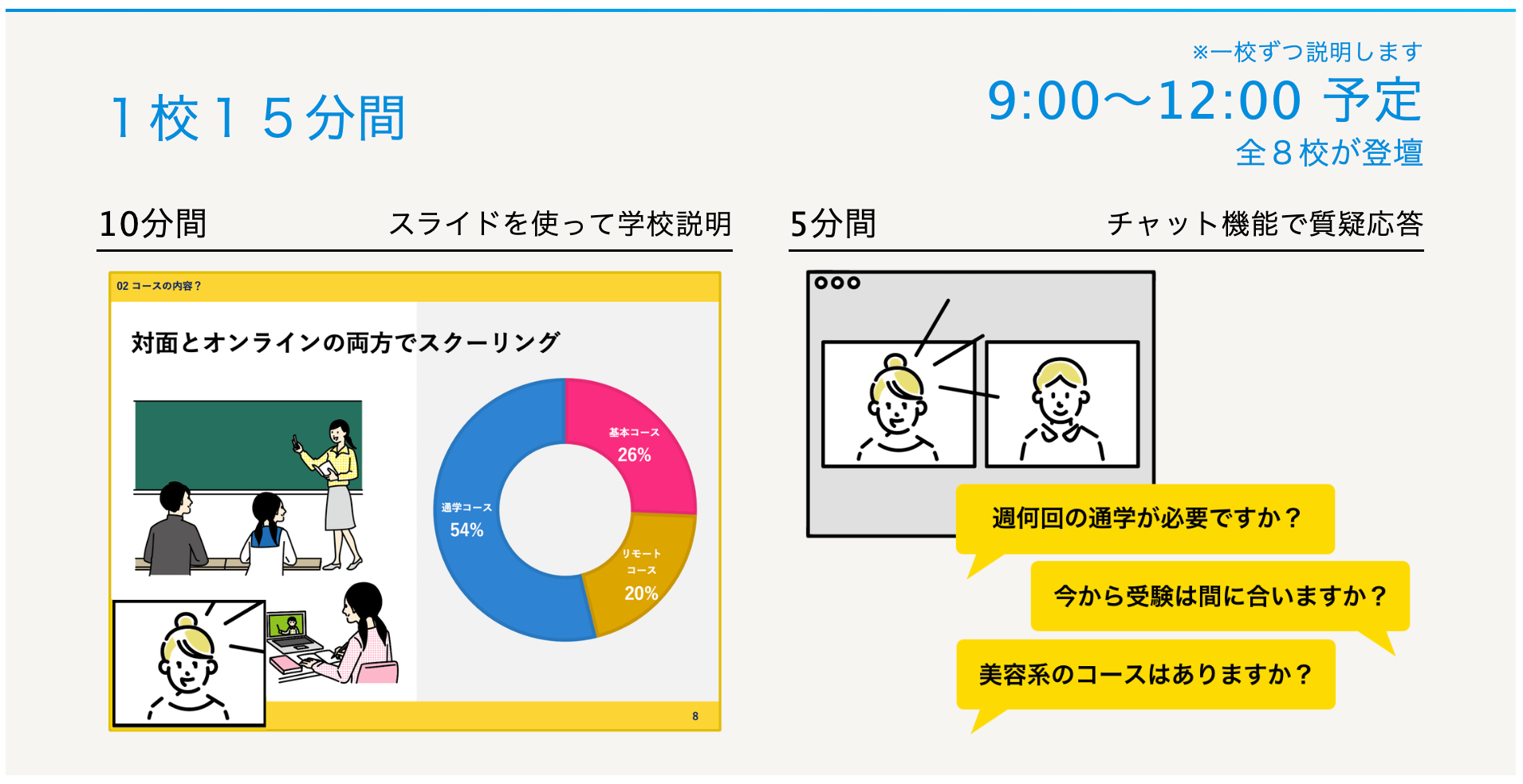 ▼各スクール15分間の説明会を行う。10分間の学校紹介と、5分間の質疑応答ができる。