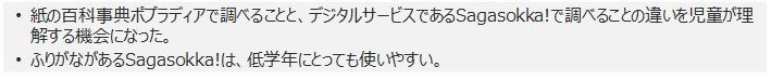 Sagasokka!の導入効果として、教職員からは、学習指導や教材研究の手助けとなったという意見や児童がインターネット上で資料を調べる方法を学べるという意見が挙がった。