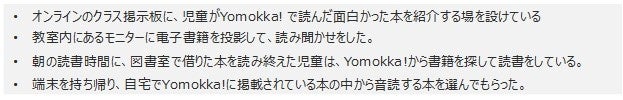 一人ひとりが持つタブレットを通じて、電子書籍に容易にアクセスし、気軽に読書することができる電子書籍読み放題サービスYomokka!の導入によって、児童にとっては、新しい本に出会う機会が増えるなど読書環境が充実したと言える。児童は、図書室で借りた本の読了後や、長期休業期間中や授業のすきま時間、図書室が利用できないときなどに積極的に利用するようになった。