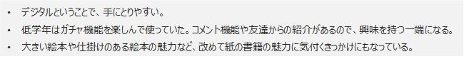 また、電子書籍と紙の書籍に触れた結果、仕掛け絵本など、電子書籍にはない紙の書籍ならではの魅力に児童が気付くきっかけになったとの回答もあった。
