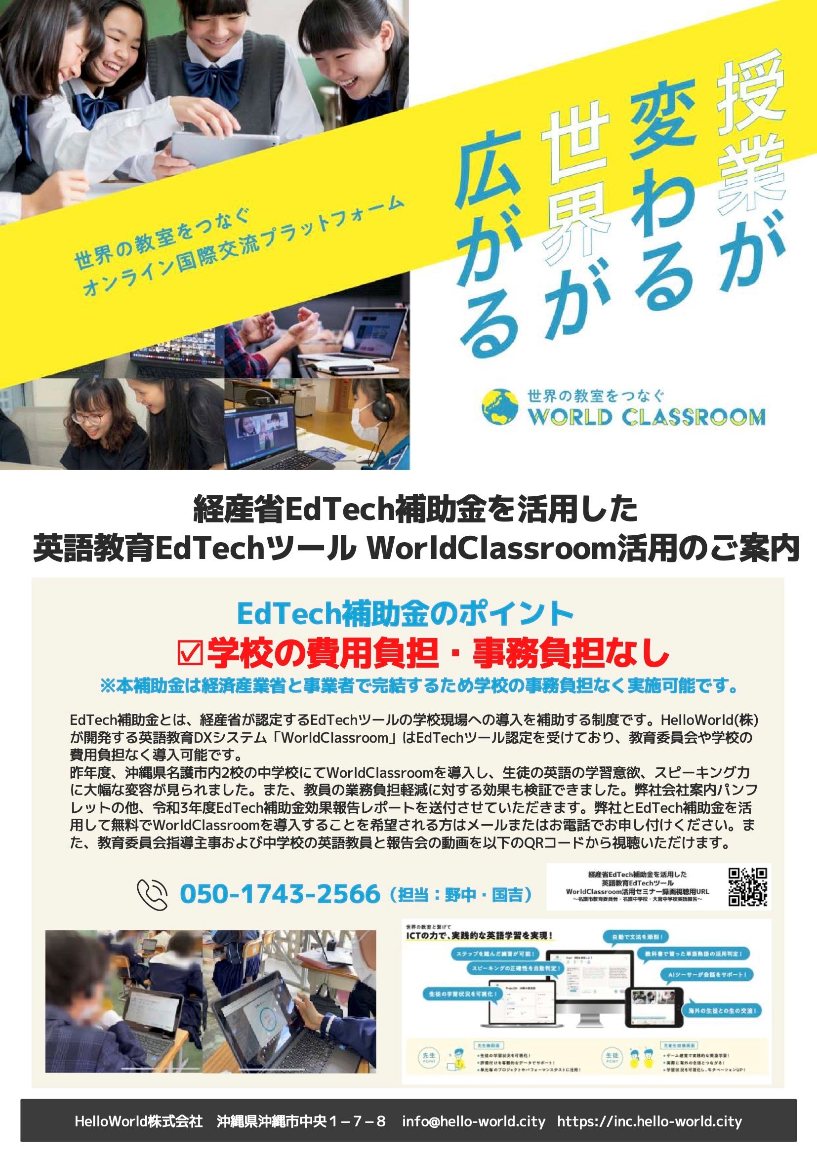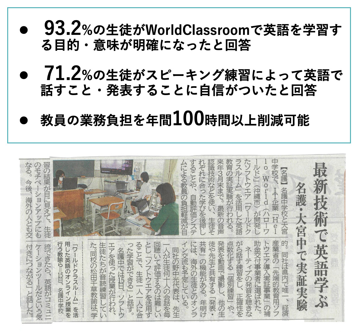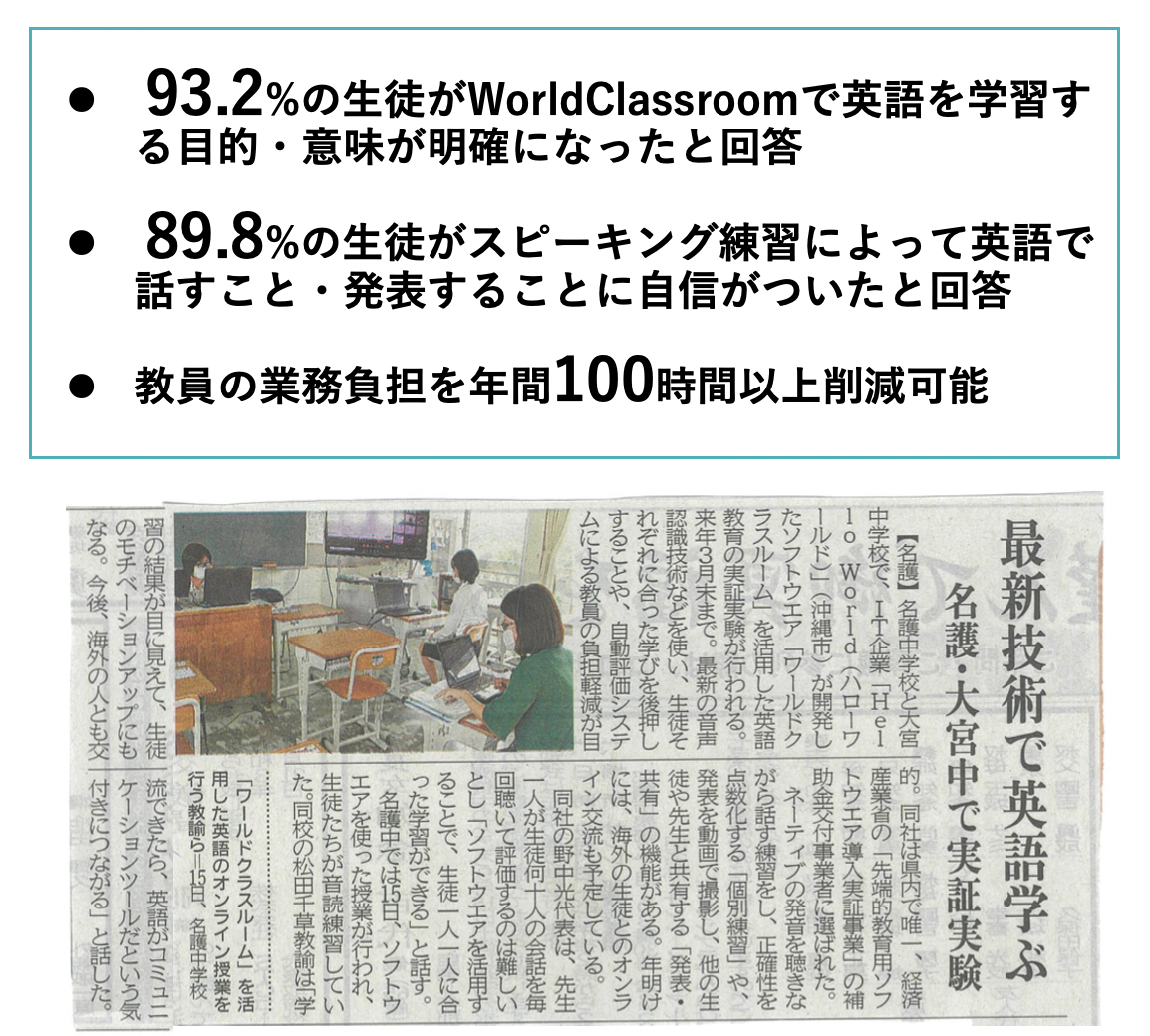 教育現場向けの英語教育DXプラットフォーム「World Classroom」を開発・運営するHelloWorld株式会社(本社:沖縄県沖縄市、CEO:野中光)は、経済産業省が実施する令和3年度補正 「学びと社会の連携促進事業(先端的教育用ソフトウェア導入実証事業)費補助金」(以下「EdTech導入補助金2022」)に採択されたことをお知らせいたします。昨年度に続き、沖縄県内では唯一の採択となりました。昨年度は名護市教育委員会との連携し、名護市立名護中学校・大宮中学校にシステムを導入し、スピーキング能力や非認知能力(動機付け等)の向上や、教員の業務負担軽減において高い効果が出ました。現在、事業事務局が令和4年度の実施校の公募を行っており、HelloWorld(株)では約20校と申請に向けて調整を進めております。