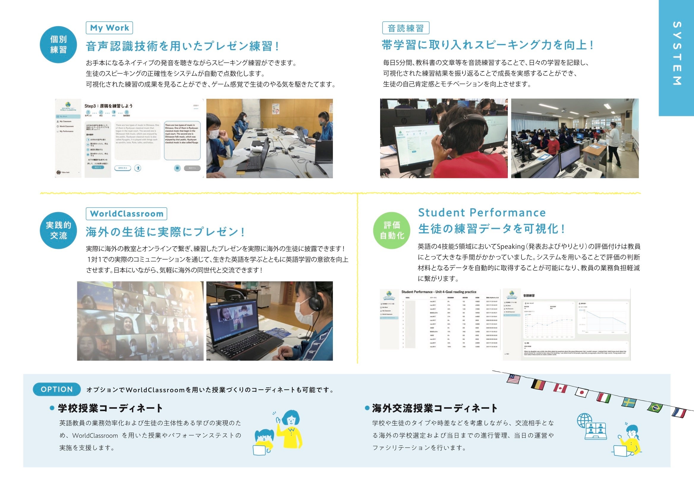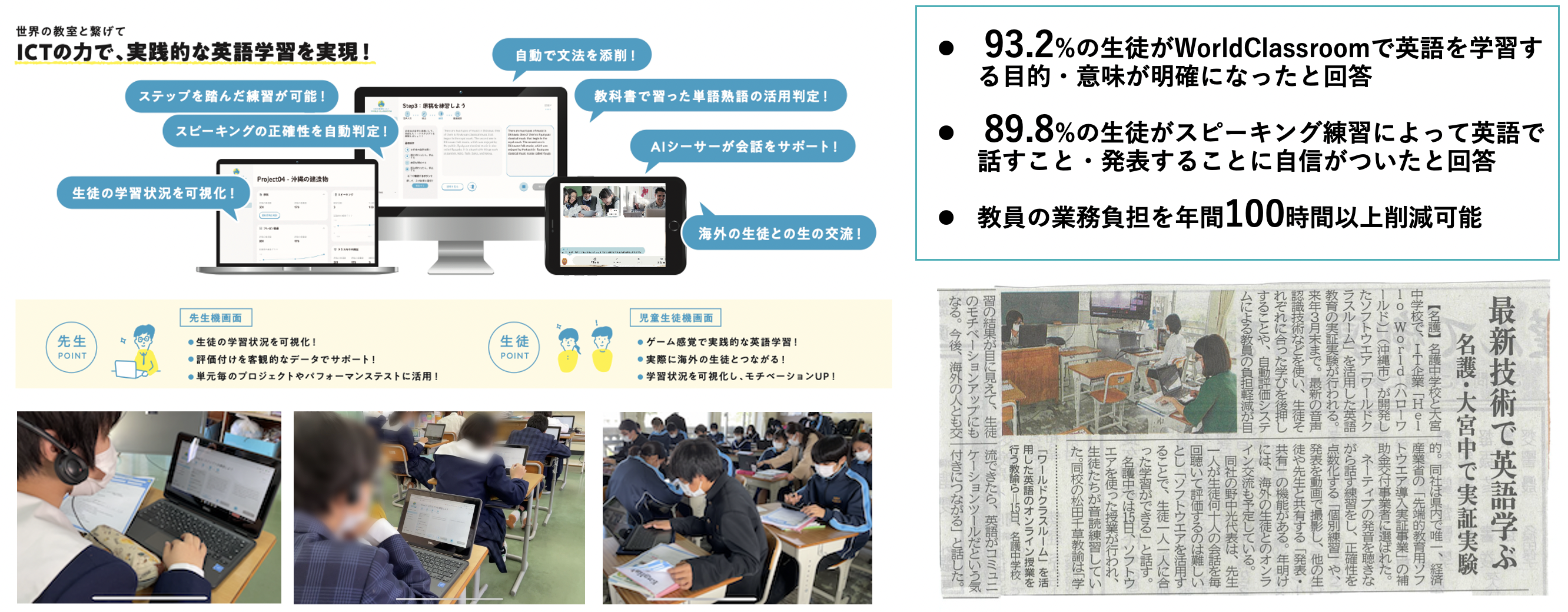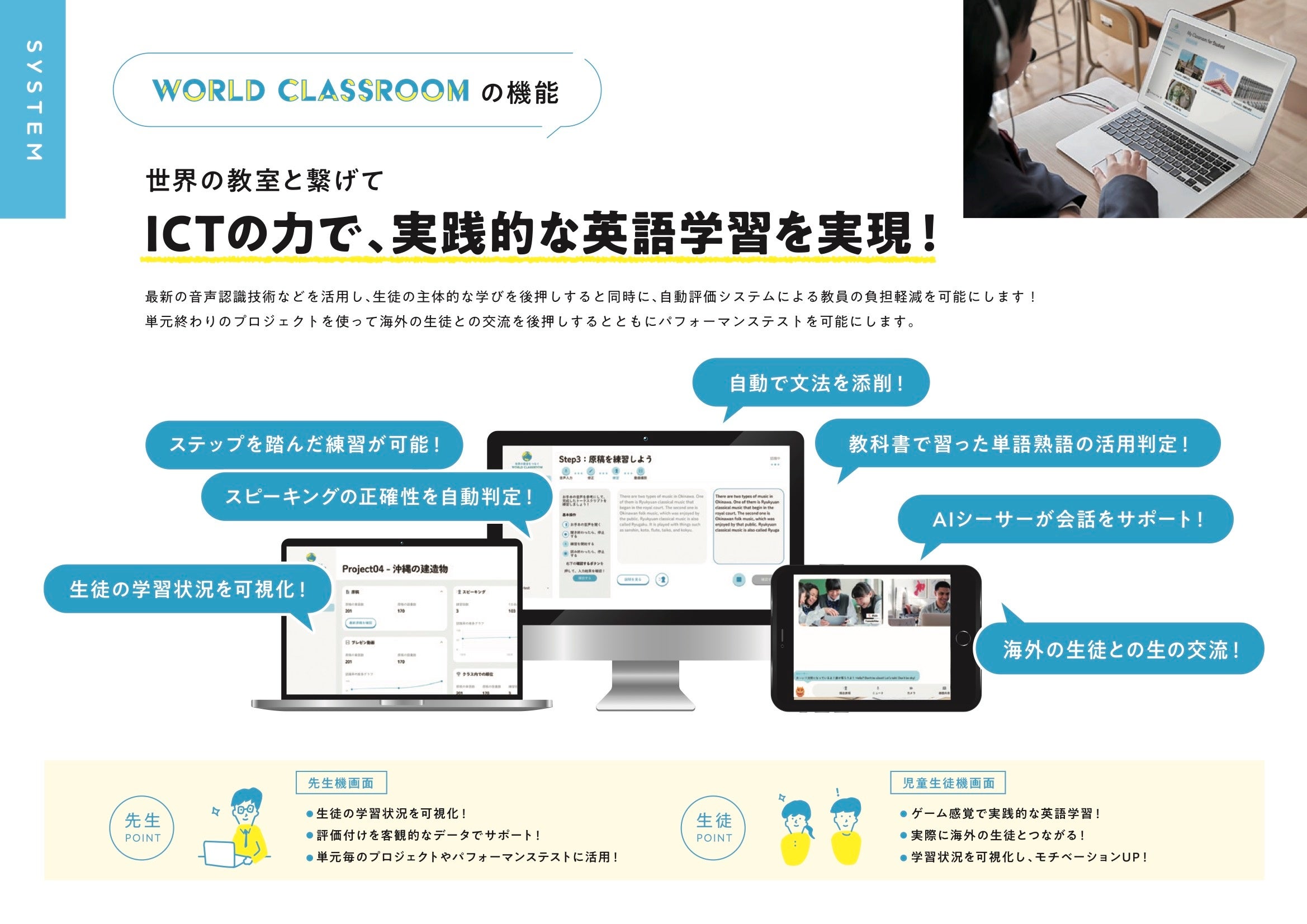 WorldClassroomとは、音声認識技術等を用いたスピーキング練習機能や世界中の同世代との国際交流機能が実装された英語教育DXクラウドシステム。これまで、名護市を始めとする県内中学校・高校や自治体の国際交流事業で導入され、スピーキング能力や非認知能力(動機付け等)の向上や、パフォーマンステスト実施や評価付けにかかる業務時間が大幅に縮小される効果が出ています。