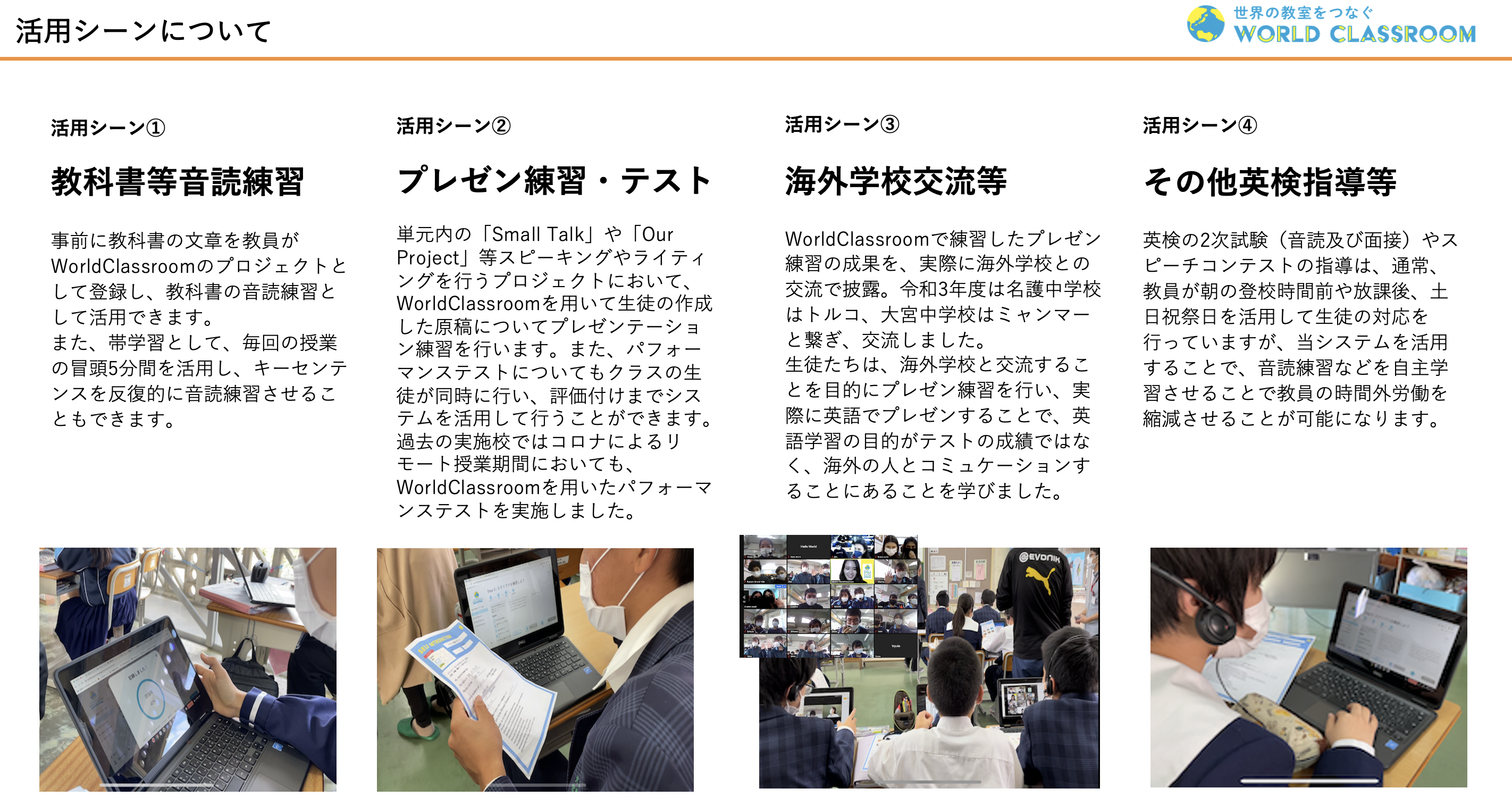 単元内の「Small Talk」や「Our Project」等スピーキングやライティングを行うプロジェクトにおいて、WorldClassroomを用いて生徒の作成した原稿についてプレゼンテーション練習を行います。また、パフォーマンステストについてもクラスの生徒が同時に行い、評価付けまでシステムを活用して行うことができます。過去の実施校ではコロナによるリモート授業期間においても、WorldClassroomを用いたパフォーマンステストを実施しました。