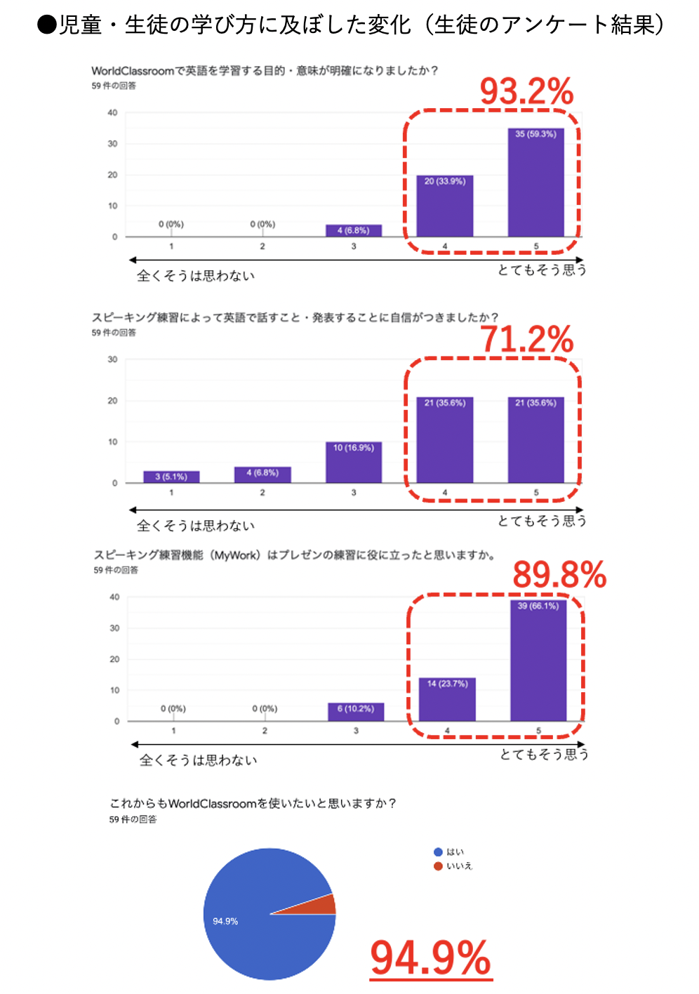 生徒たちは、海外学校と交流することを目的にプレゼン練習を行い、実際に英語でプレゼンすることで、英語学習の目的がテストの成績ではなく、海外の人とコミュケーションすることにあることを学びました。