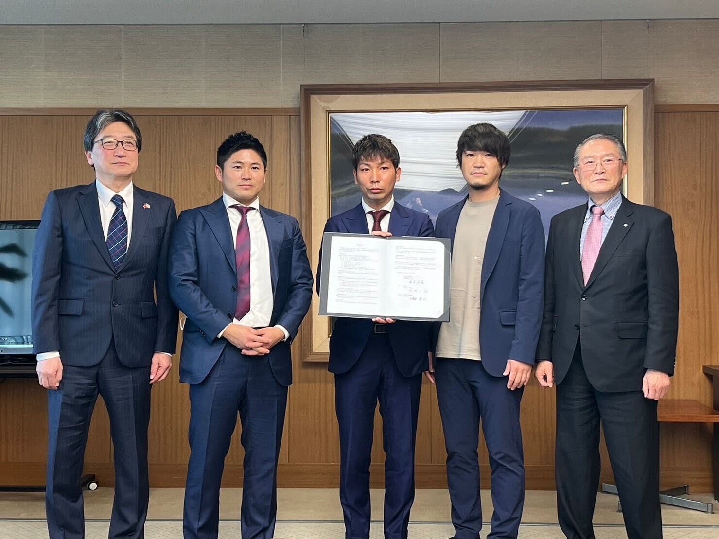 (写真:左から 熊本県商工労働部長 三輪孝之様 、株式会社LiNew COO 井上陽介、CEO 西本弘昌、株式会社MARUK代表取締役 小山光由樹様、芦北町長 竹崎 一成様)