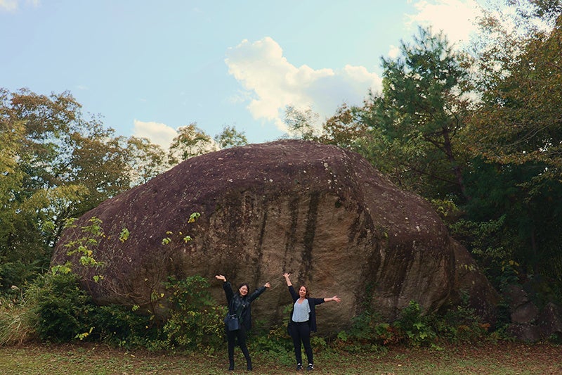 目田森林公園内にある、「出雲のエアーズロック」とでも言うべき巨大な岩です。須佐之男命による鬼退治伝説が残る当地において、鬼が腰を掛けて休んでいたとされています。目田森林公園内ではキャンプや釣り、巨大迷路などを楽しむこともできます。