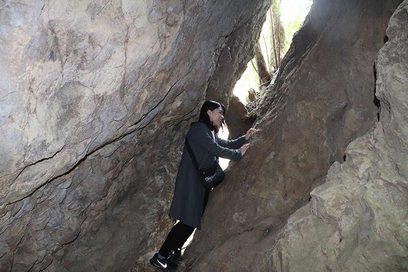 岩に守られるように立つ本殿には、急な石段を15分程度登り、最後は約50cmの岩の割れ目を抜けなければたどりつくことができません。人目を避けた場所に佇む、神秘の神社です。