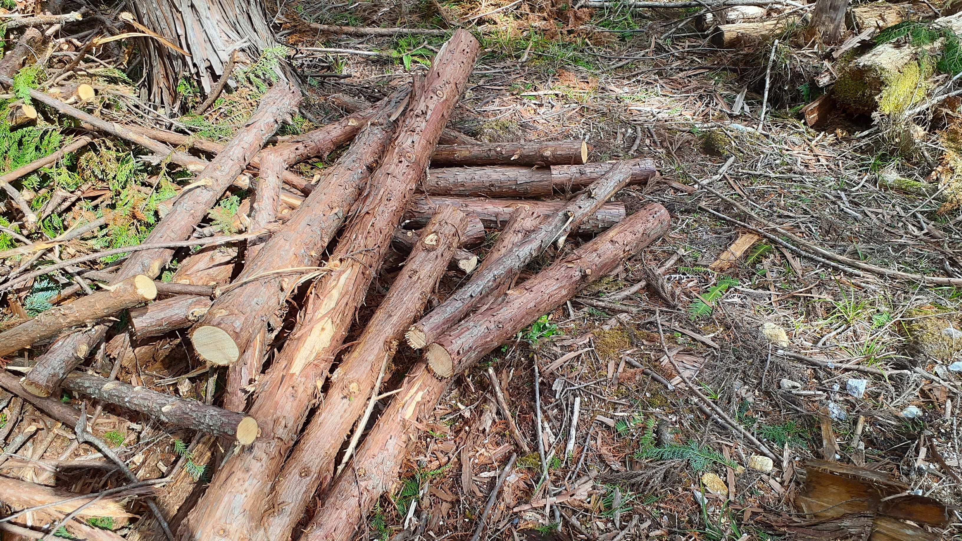 間伐直後のため、ブッシュクラフトに使えそうな新しい丸太や枝がたくさん落ちています。
