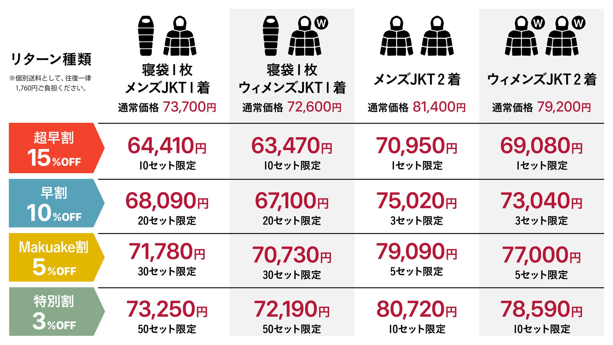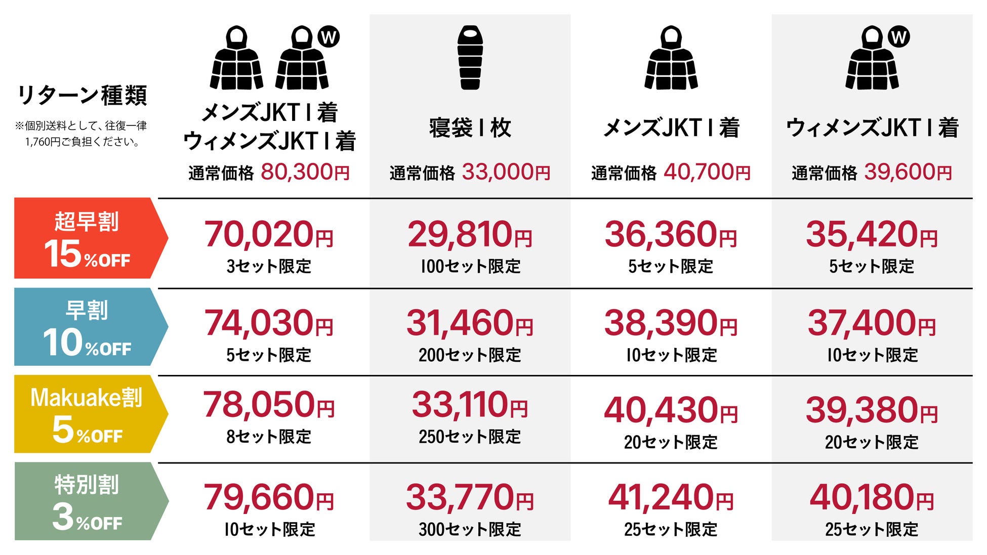 「既にダウン寝袋は持っている」「ダウンジャケットを夫婦で着たい」「リターンはダウン寝袋だけでいい」……。