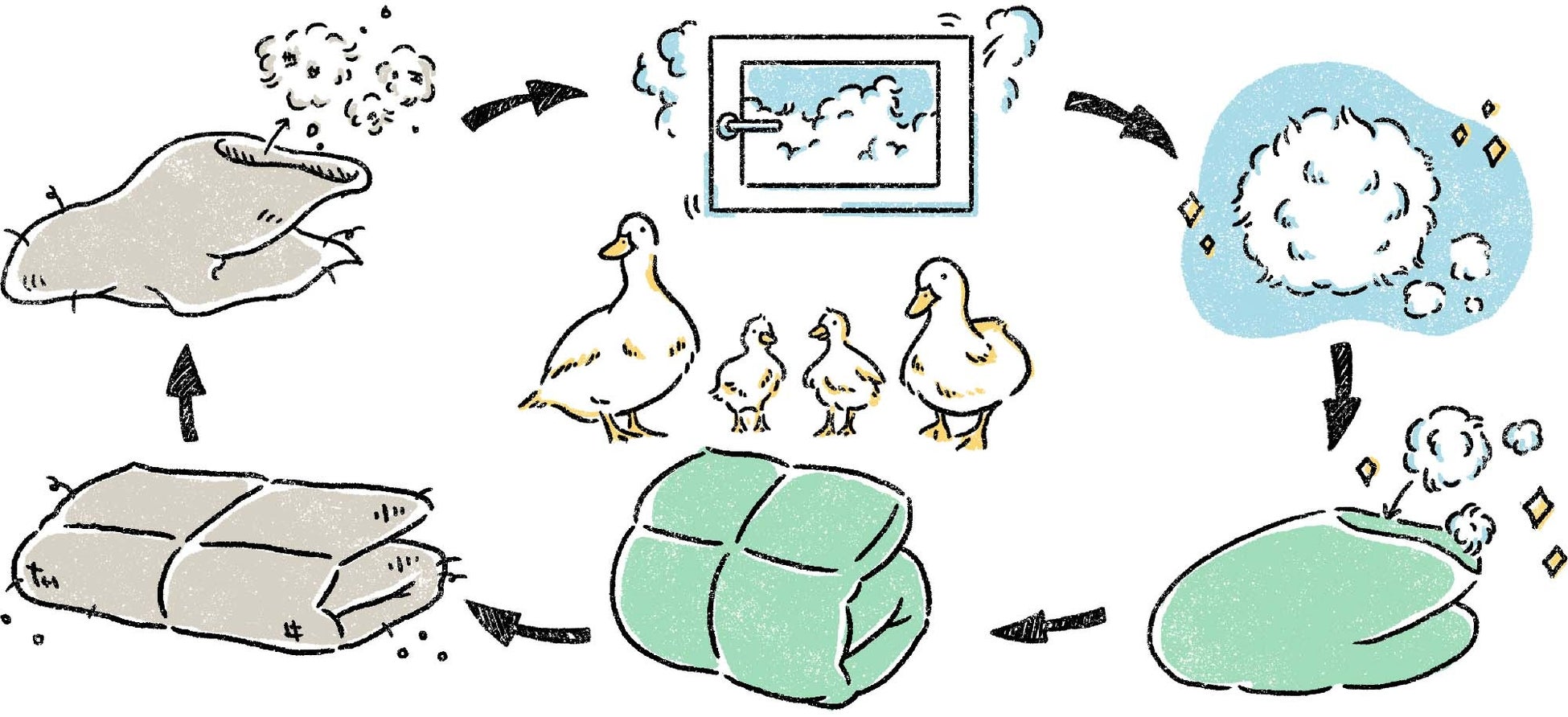 プロジェクトの受付終了から少々お時間を頂戴しますが、2024年12月よりサポーター様に羽毛布団回収キットを送付させていただき、回収後5ヶ月ほどで製品としてお戻しします。詳しい流れは下記をご確認ください。