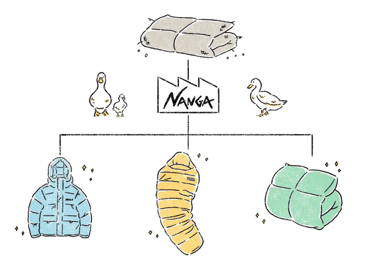 NANGAはアウトドアと対峙する製品を生み出すダウンメーカー。私たちのフィールドとなる自然を尊び、慈しむためには、環境負荷を抑え、むしろ自然に還元する製品を作ることは責務。その点において、資源の再利用は初歩的かつ重要なアクションだと考えています。