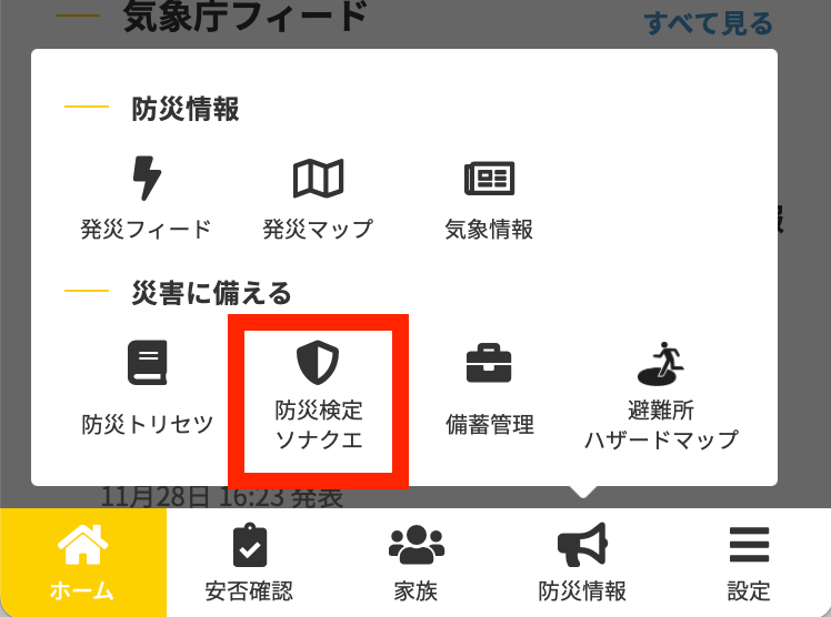 クロスゼロforファミリーのアプリを開き、メニューの防災情報から「防災検定ソナクエ」を選ぶことでご利用いただくことができます。