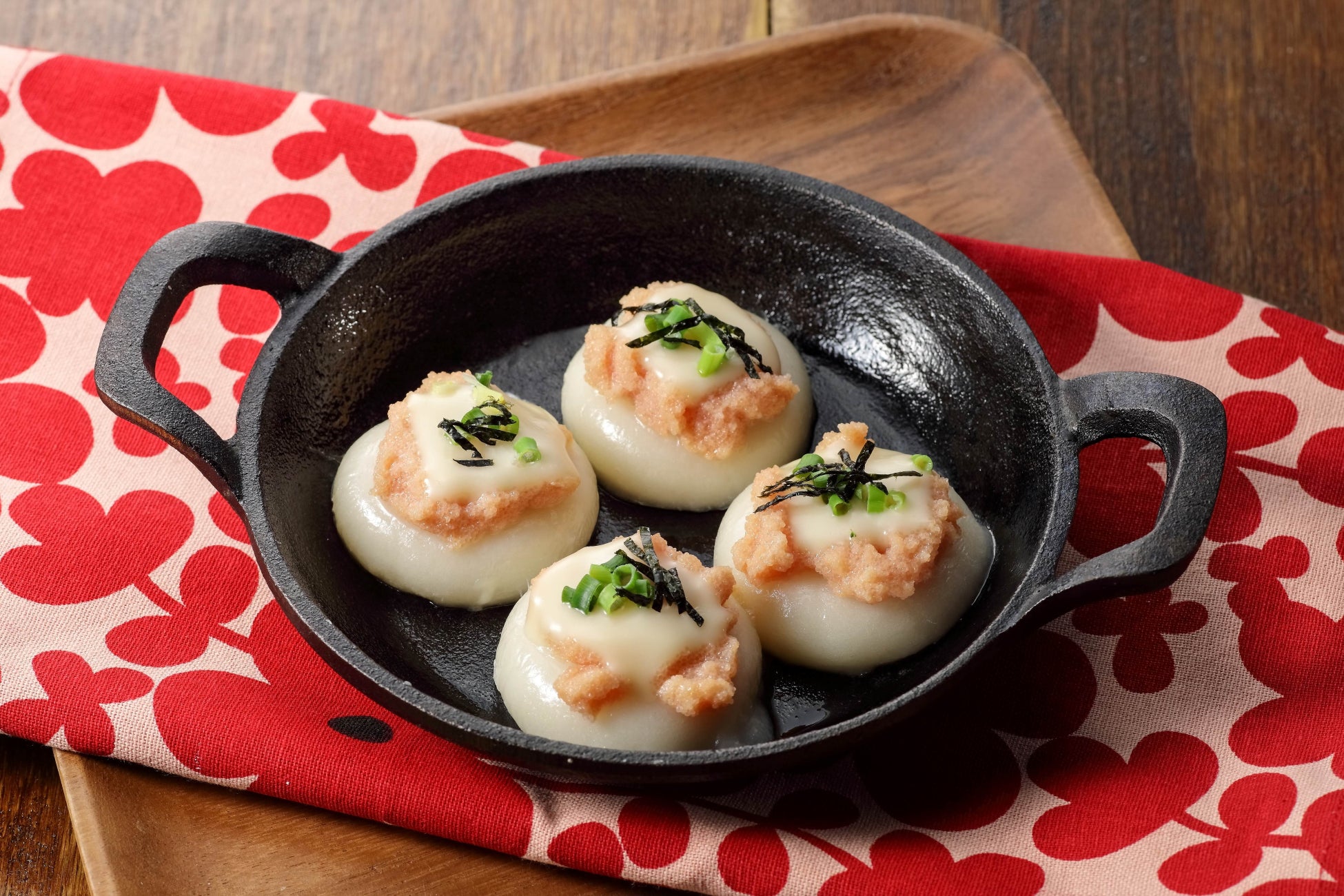 ③ 餅がやわらかくなったら裏返し、①のたらこ、1 4に切ったチーズ、小ねぎをのせてチーズがとろけるまで蓋をして加熱する。