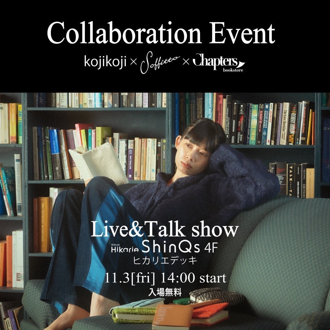 次世代が注目するアーティスト・kojikojiをお迎えし、Chapters書店・Soffittoによるトークイベント+新曲初公開のスペシャルアコースティックLIVEも11月3日無料開催決定。kojikojiデザインのSoffittoコラボ商品もイベント当日販売開始。
