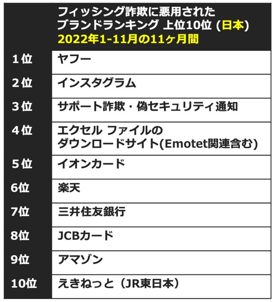 ■2022年1-11月、日本でフィッシング詐欺に悪用されたブランド/企業ランキング