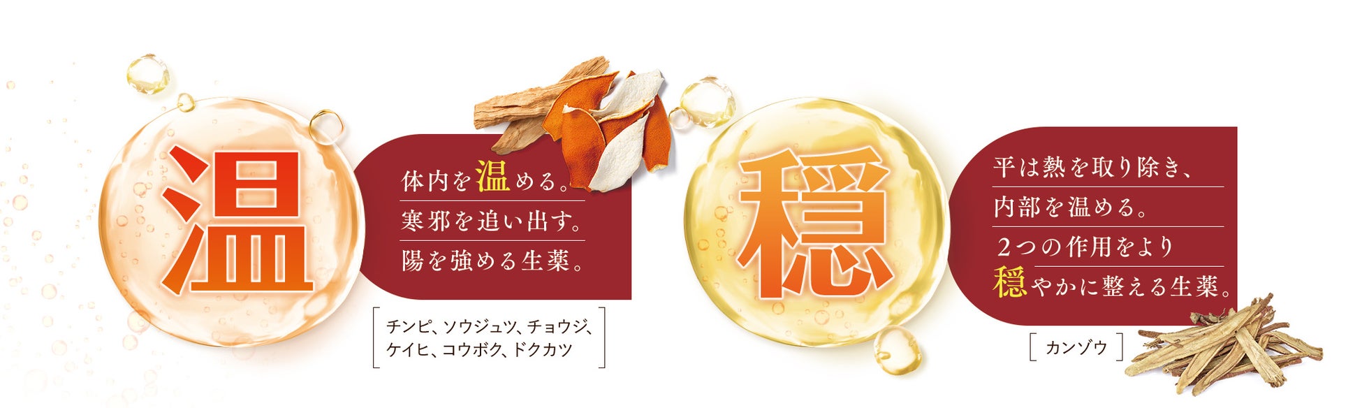 深部からしっかり温める「温」と、「平(=穏)」からは穏やかなバランスに整えてくれる生薬を選定しています。