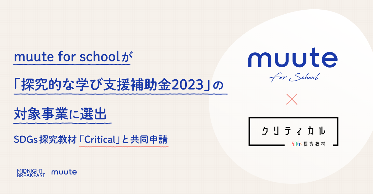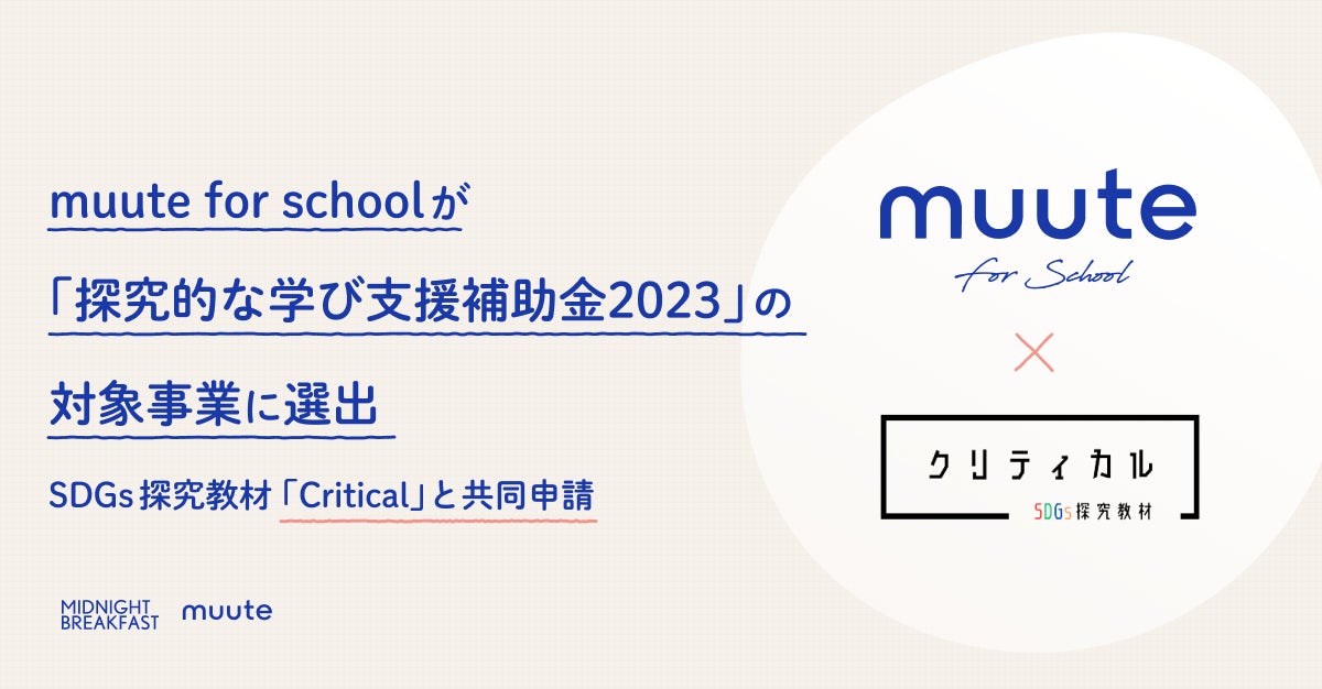 プロダクトスタジオのミッドナイトブレックファスト株式会社(本社:東京都渋谷区、代表取締役:喜多紀正、以下、「当社」)は、当社が開発・運営するAIジャーナリングアプリ「muute(ミュート)」の学校向けサービス「muute for school」の利活用を推進するため、経済産業省が実施する「探究的な学び支援補助金2023」の対象事業者として選定されました。なお本申請はSDGs探究教材「Critical」との共同申請であり、本補助金の対象期間中『muute for school』及び『Critical』を無償でご利用いただけます。「探究的な学び支援補助金2023」を利用した無償での「muute for school」の活用にご興味がございましたら、以下登録フォームからご連絡ください。