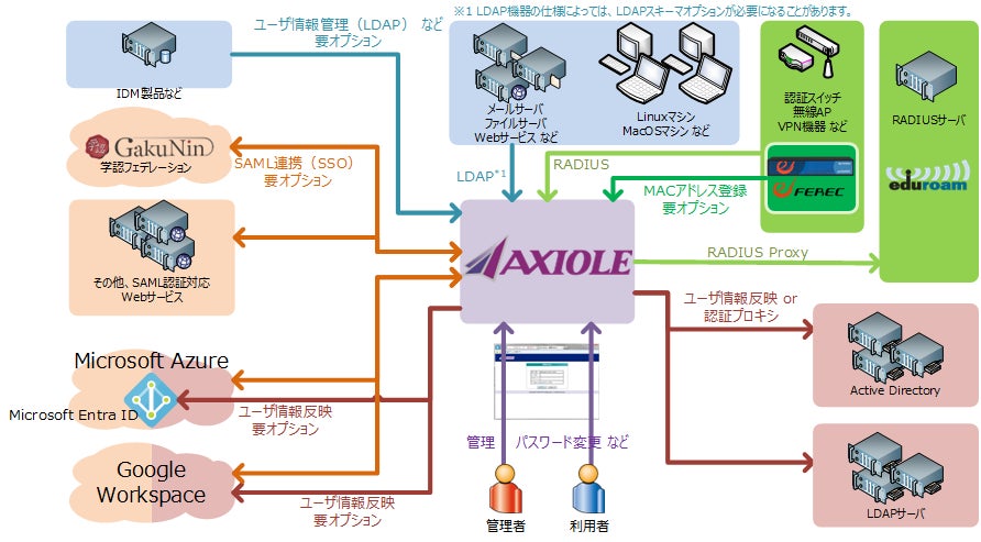 ネットスプリングのAXIOLEは、LDAP、RADIUS認証プロトコルに対応し、認証機能に特化したオールインワンの認証アプライアンスサーバ製品です。Active Directoryや他のLDAPサーバとの連携機能を標準実装するとともに、Shibboleth IdP、Google Workspace (旧Google Apps)およびMicrosoft Entra ID(旧Azure Active Directory)との外部連携機能をオプションで選択・追加組込が可能です。ハードウエアアプライアンス版や仮想アプライアンス版(VMware vSphere版およびNutanix AHV版)の他にクラウド版(Microsoft Azure対応版・Amazon AWS対応版)もラインナップされています。2006年末の製品初出荷以来、ネットワーク認証機能をコンパクトに提供する設計思想と、導入運用の容易性や安定性が支持され、大学・高専等、多数の高等教育研究機関で導入運用されてきました。近年では中堅規模以上の民間企業においても導入が進んでいます。