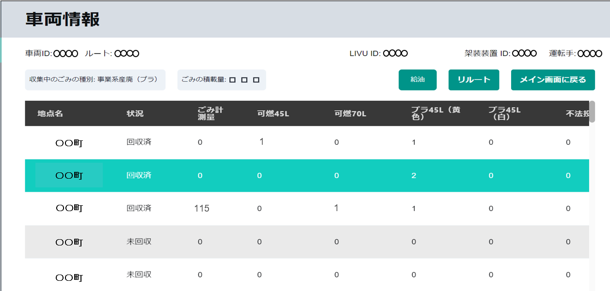 収集地点を示す地図や目的地までのルート、収集地点別に定められた約束事や注意事項などのノウハウを車載モニターに表示します。本機能を活用することで、業務に習熟していない新規雇用者や急な応援を依頼したドライバーにおいても、熟練者に匹敵する効率的な収集業務が可能です。
