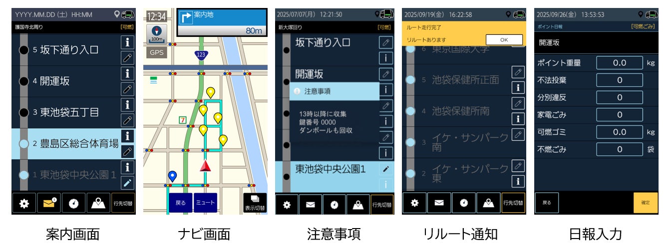 右左折のタイミングを音声で案内するほか、スクールゾーン等の規制提示や、塵芥車が走行可能な道路幅を考慮したルート案内など、車両の特性に応じた安全走行を支援します。