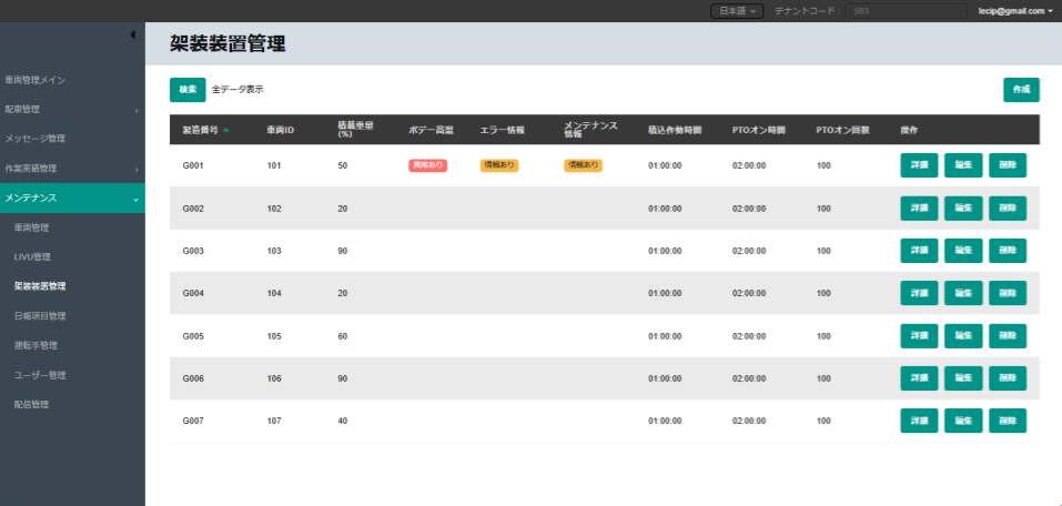車両の運行を采配する管理者は、画面上で登録した全ての車両の現在位置や作業状況(走行中、休憩中など)、積載状態の目安をリアルタイムに把握できます。