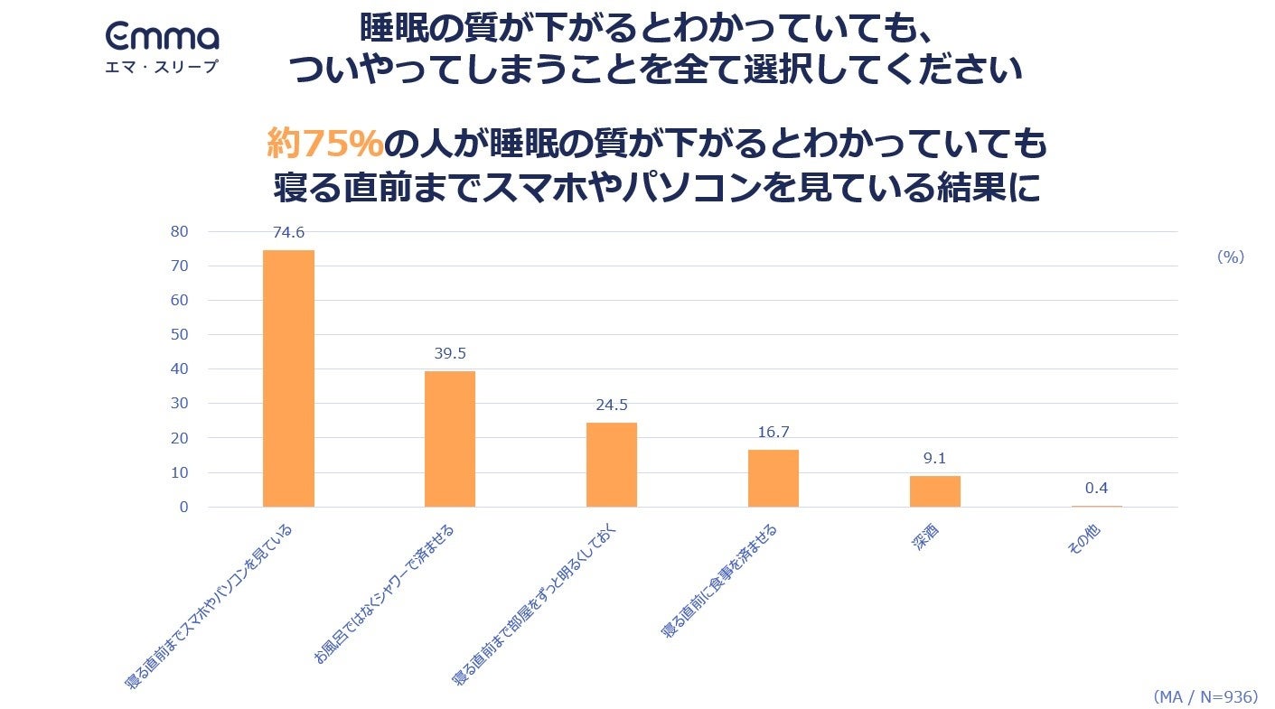 一方で、『知っている睡眠の質を上げる方法の中で実践中のもの』を伺うと、約25%が、「現在実践中のものはない」と回答。さらに、約75%の人は、睡眠の質が下がるとわかっていても寝る直前までスマホやパソコンを見ていると回答し、睡眠への意識は高い一方で、仕事や育児など、多忙な現代人にとって、睡眠の質は上げたいが、なかなかノウハウを実践できていない状況が見て取れる結果となりました