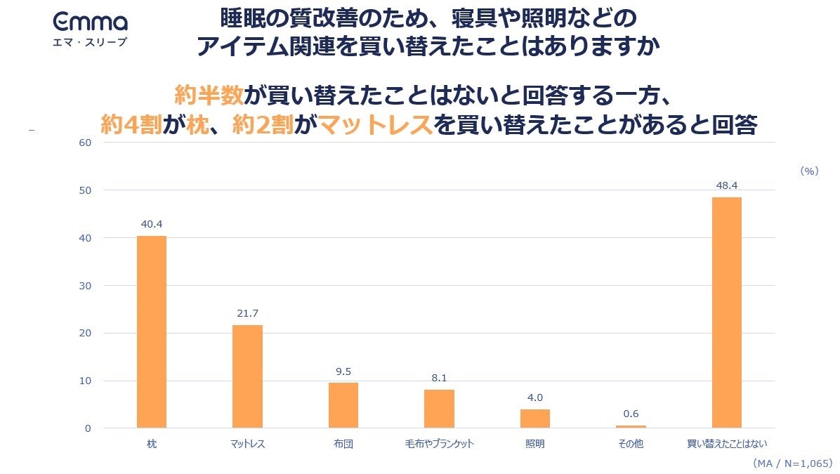『寝具や照明など、睡眠に直接関係するアイテムを睡眠の質改善のために買い替えたことがあるか』という質問に対し、「買い替えたことはない」が約半数を占める一方、約4割が枕、約2割がマットレスを買い替えたことがあると回答。睡眠の質向上のための選択肢として、寝具などを買い替える層が一定数いる事が判明しました。