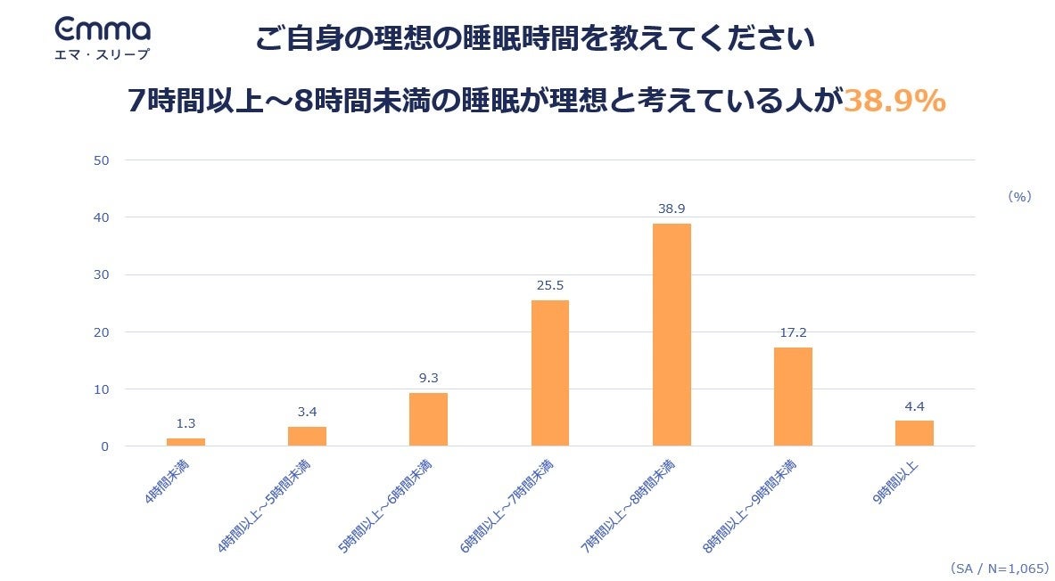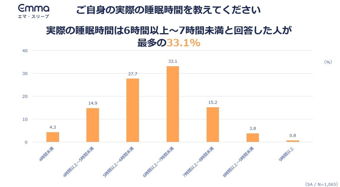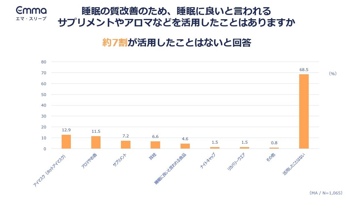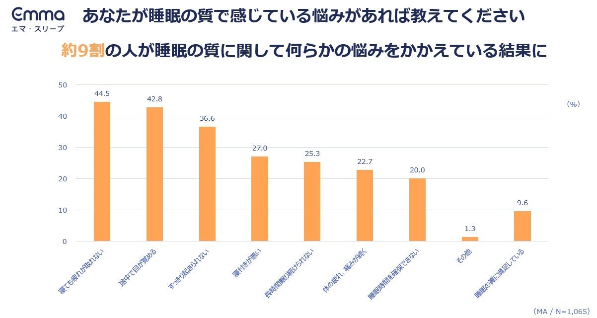 睡眠に関わる製品およびサービスを提供するスリープテック・ブランドEmma Sleep Japan合同会社(本社:東京都港区、代表:マヌエル・ミュラー、以下エマ・スリープ)は、「睡眠の質と睡眠ノウハウに関する意識調査」を、全国の20~59歳の男女1,065人を対象にインターネットで実施しました。