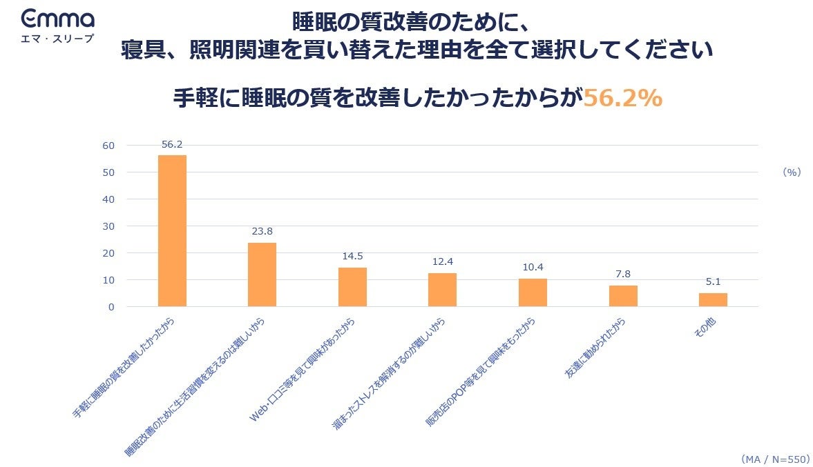 また、『睡眠の質改善のために、寝具や照明関連を買い替えた理由』について伺うと、「手軽に睡眠の質を改善したいから」が56.2%と最多になり、質の高い睡眠をとりたいが、ノウハウは実践できていない人が多くいる結果とも関係する結果となりました。
