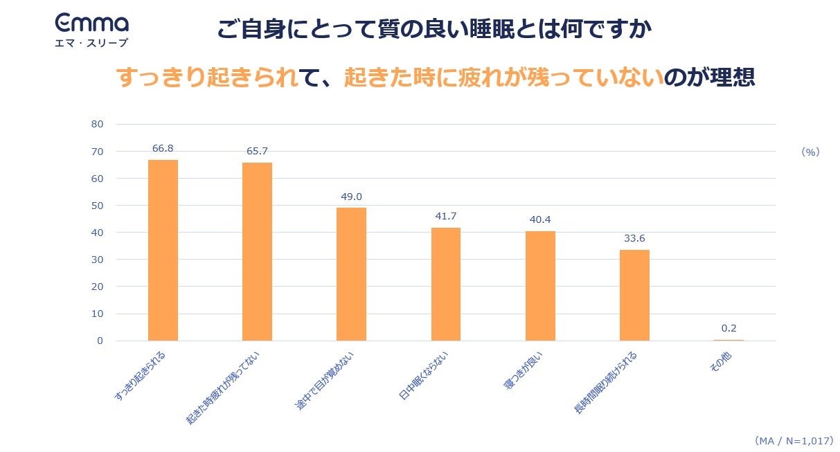 ■約7割の人が、質の良い睡眠の理想としてすっきり起きられて、起きた時に疲れが残っていないと回答