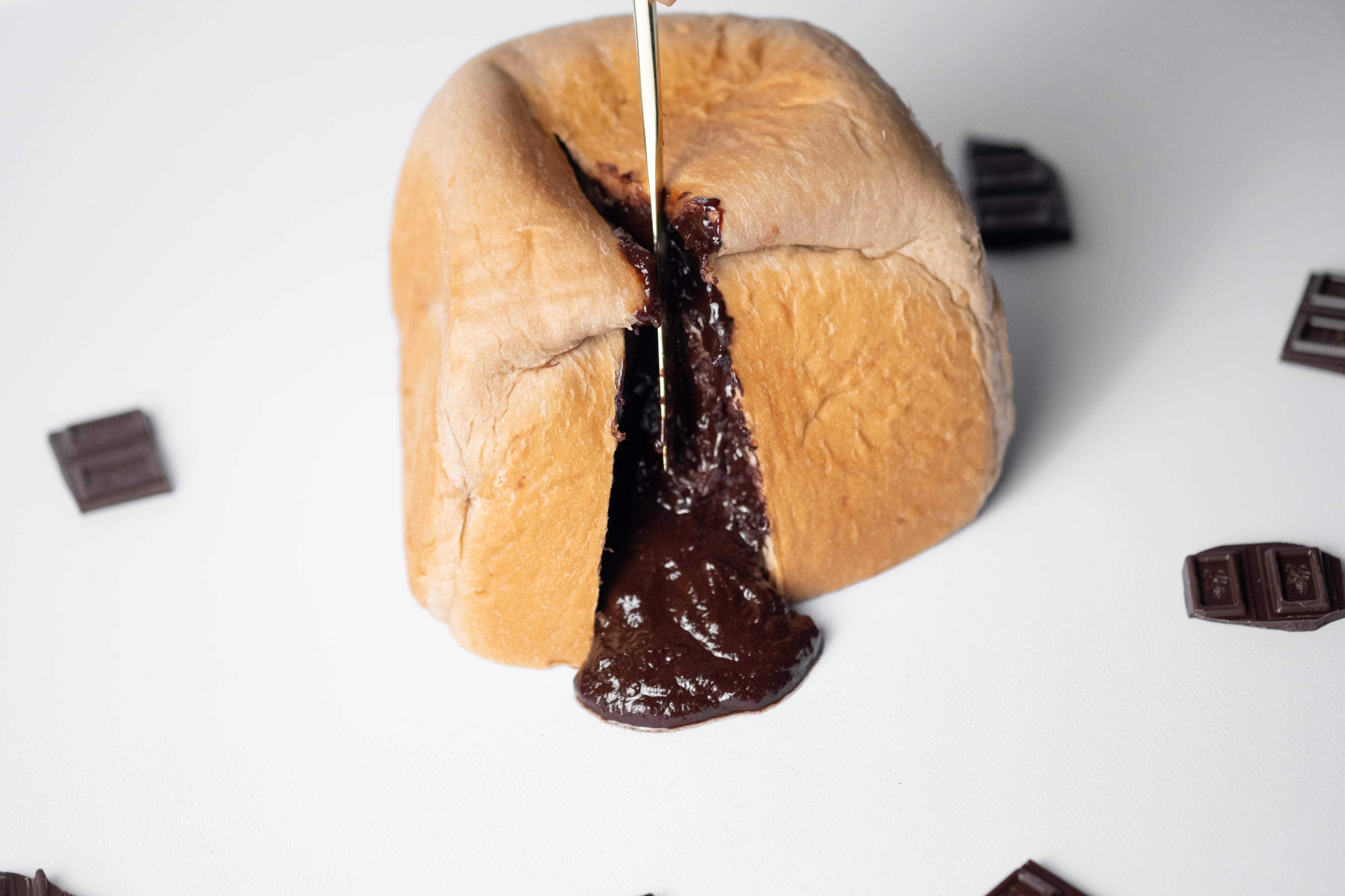 「 STEAM BREAD fondant chocolate」は、バレンタインの楽しみ方が多様化する中で、”食パンをもっと多様に”というコンセプトを掲げるスチームブレッド としてシーンを問わず、食パンを軸にチョコレートを楽しむ体験を提供できたらと考え誕生しました。ガーナブランドが展開する“バレンタインのせいにして。“キャンペーンと連動し、「チョコですべてを満たして、自分を甘やかそう。」をテーマに設定。しっとりもちもちなSTEAM BREADの中に、ガーナチョコレートを一枚まるごと使用した贅沢なプロダクトに仕上げました。レンジでチンをして、ナイフとフォークで切り込みを入れるとチョコレートが流れ出す、新たな食パンの楽しみ方を提案します。普段はちょっと罪の意識を感じる食体験を”バレンタインのせいにして“チョコで自分を満たす、甘いひとときに変換します。