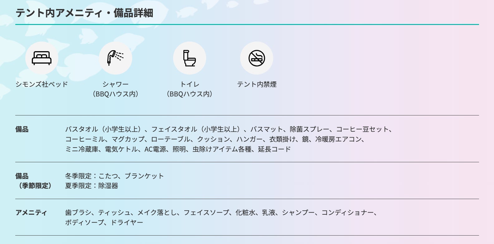 ・全てのテントに共通した充実のアメニティ