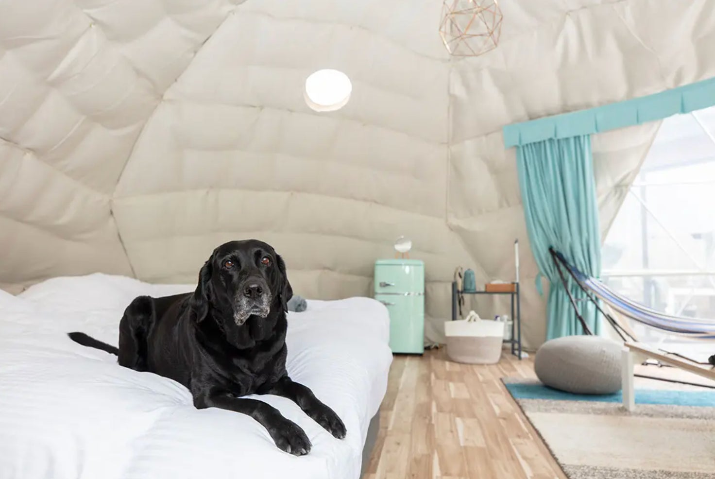 「ペットが一緒に泊まれて、ペット用品も充実」ペット同伴ドームテントでは、室内及びサイトのフェンス内でペットとリードなしに過ごすことができます。犬・猫・うさぎなどご家族同然のペットと癒しのひと時を過ごすことができます。