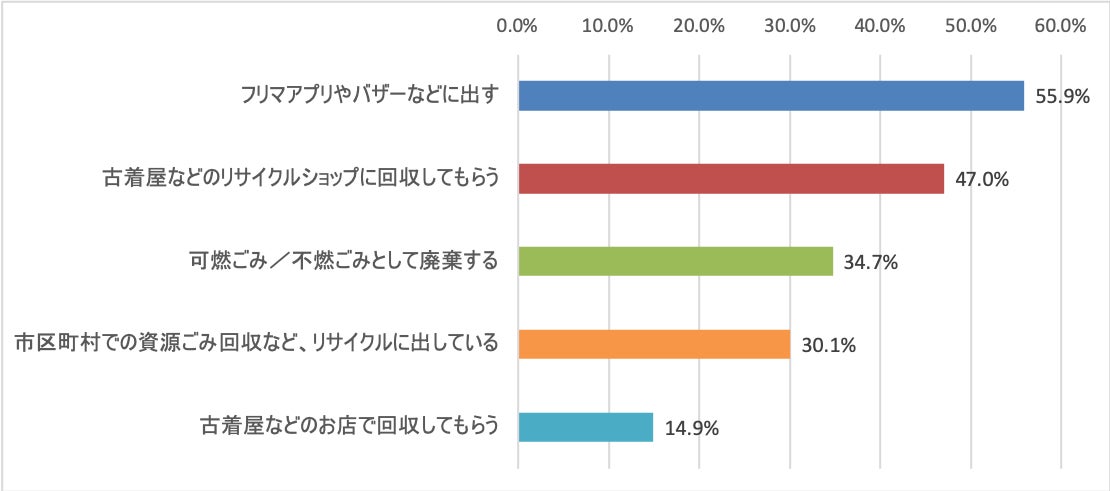 不要になった衣類の処分方法としては、「フリマアプリやバザーで販売」という回答が56%、次いで「古着などのリサイクルショップに回収してもらう」が47.0%と、約半数以上の人が次の人へ届けられるようリサイクルを選択しており、日常生活の中で出来ることから始めている人が目立ちました。